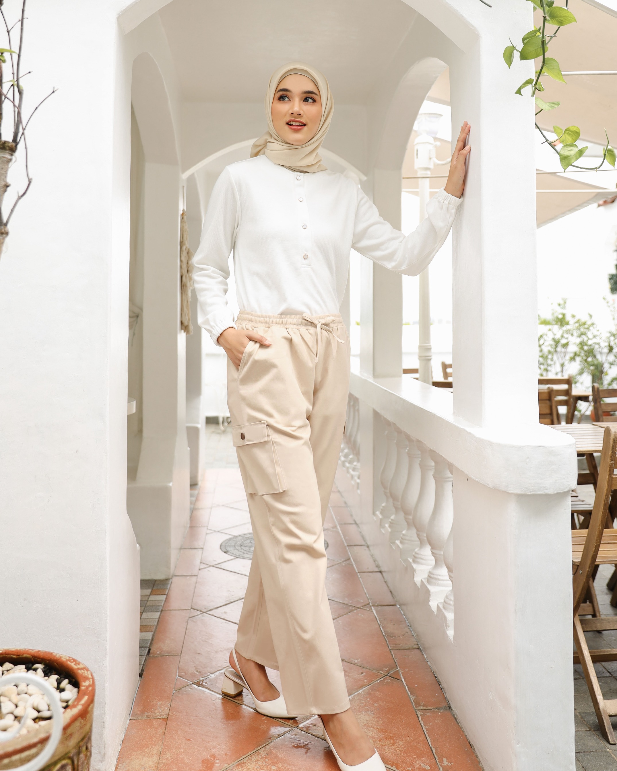 Bahan Chinos twill. Tenal, tidak nerawang dan nyaman tidak bikin begah. Celana bergaya boyish dengan warna earth tone.