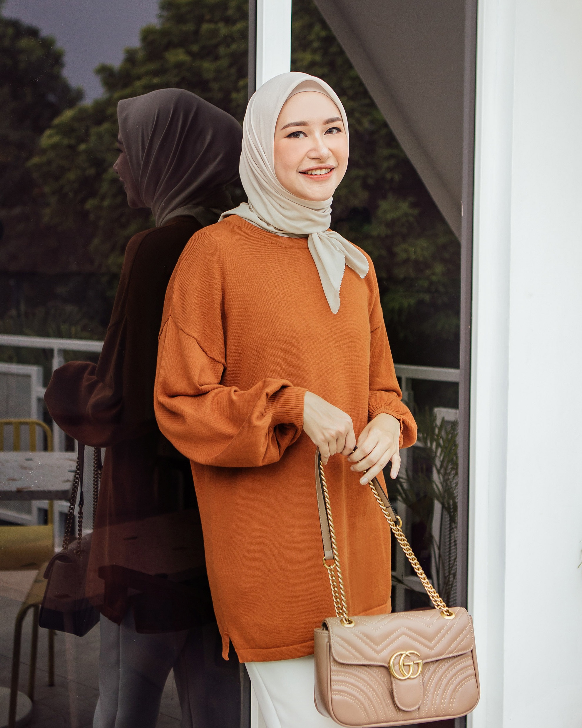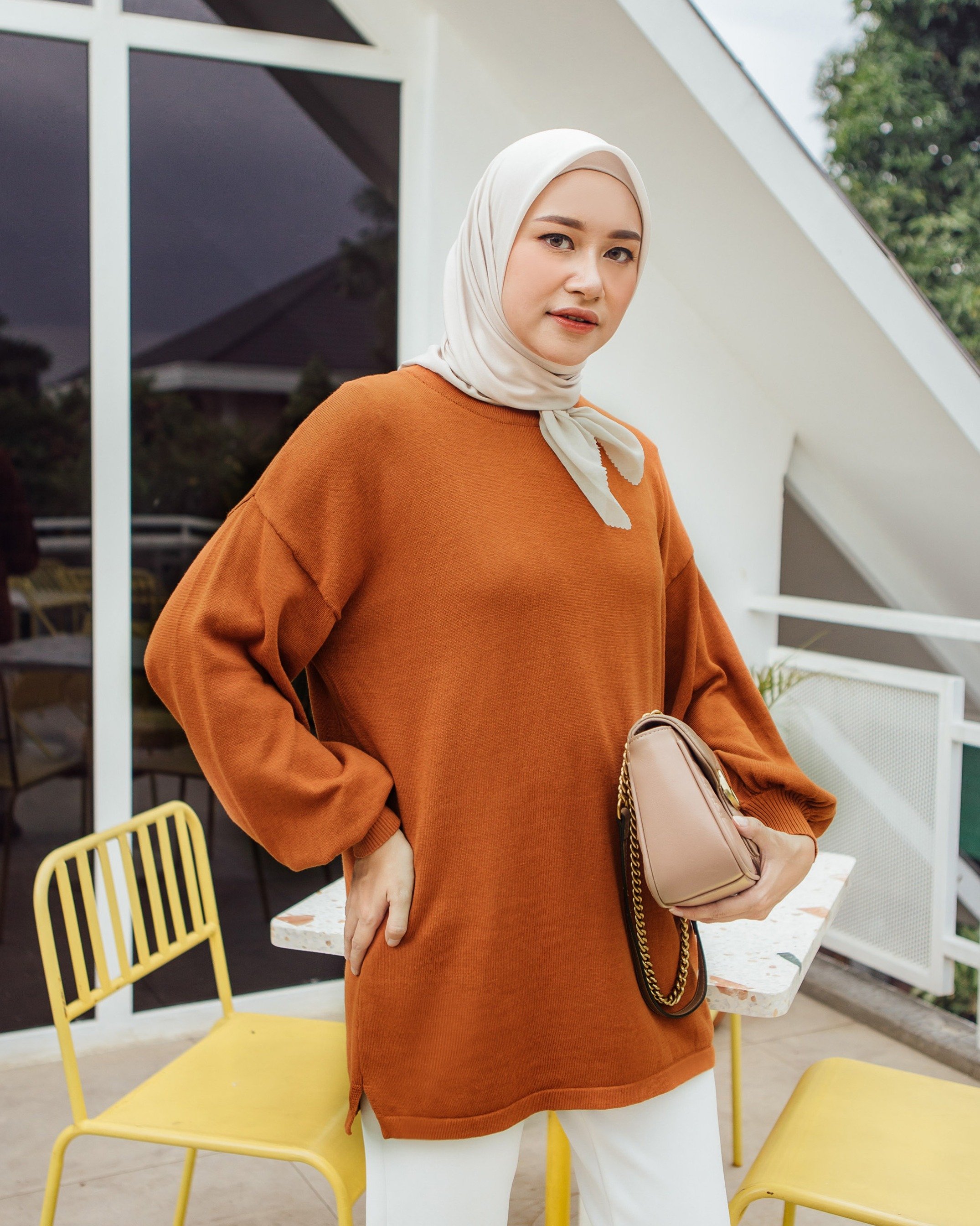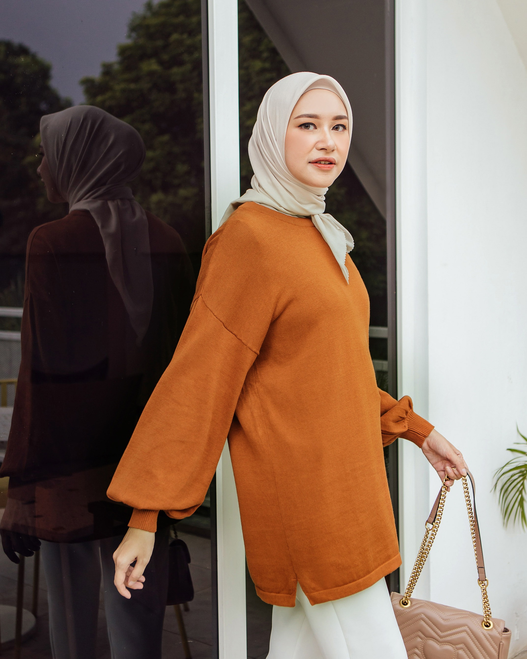 Bahan knitting cotton 100%. Rajut nya sangat nyaman di kulit. cukup tebal dan tidak menjiplak. Seluruh sisi strech, dan dipermanis dengan cuttingan lengan baloon.