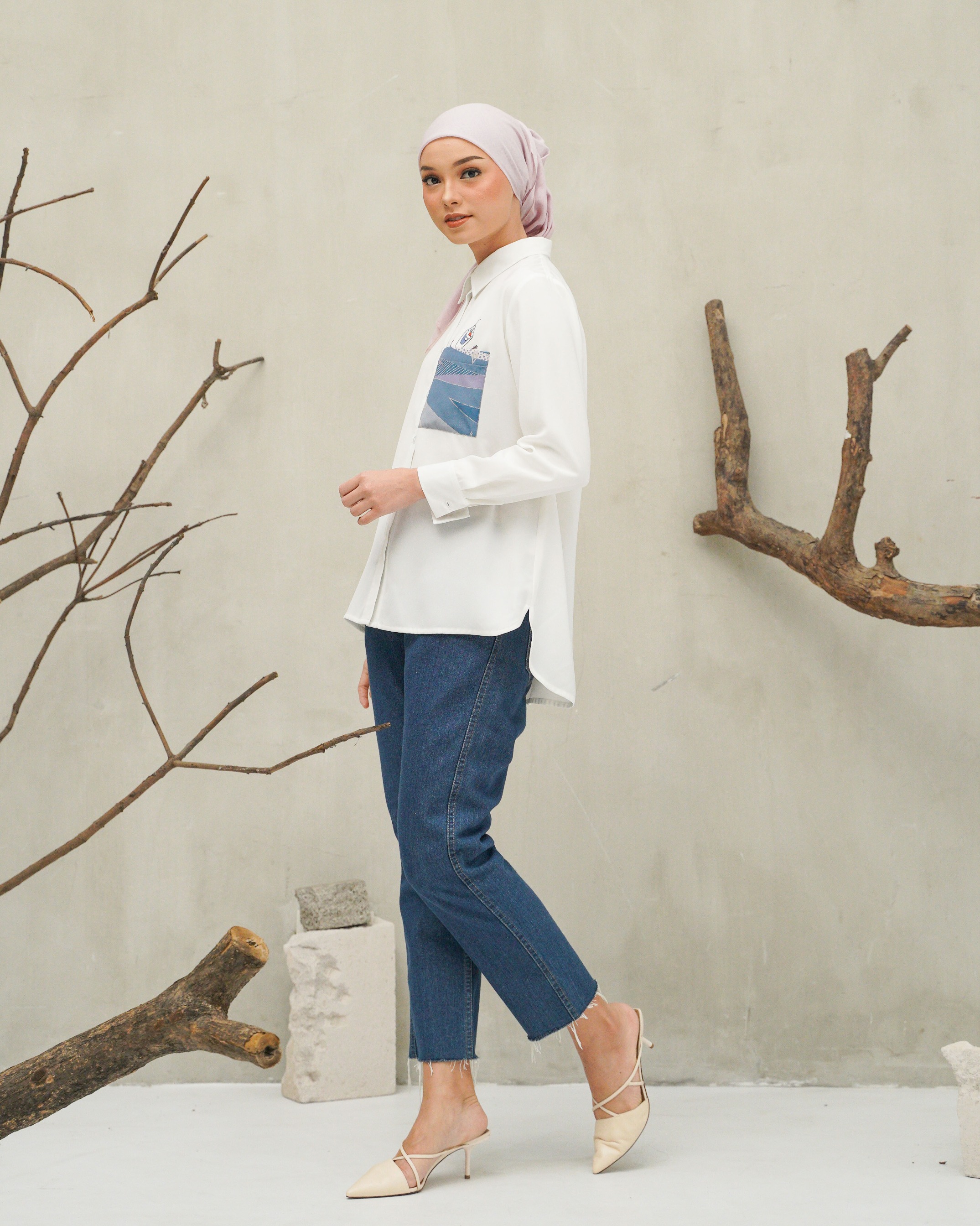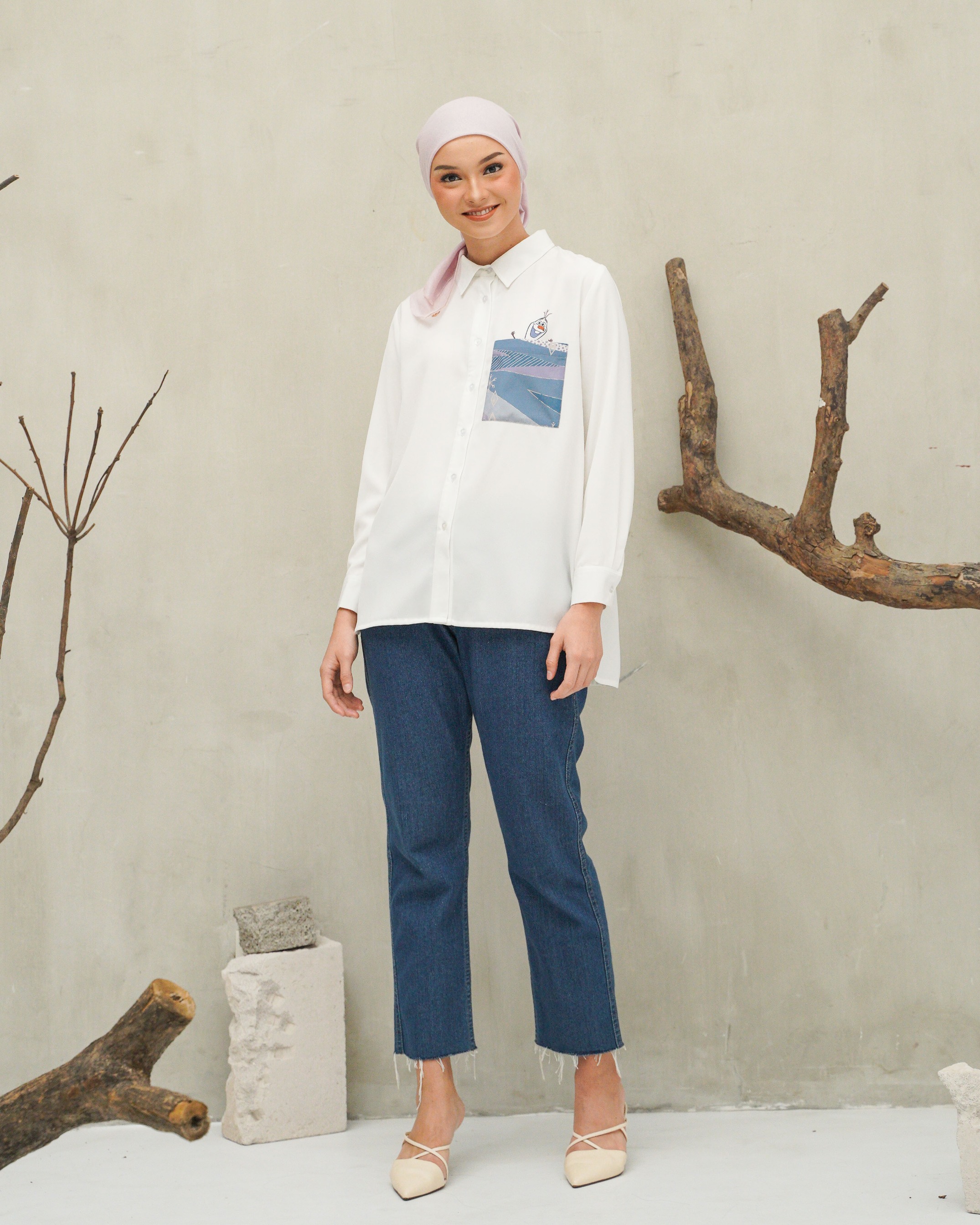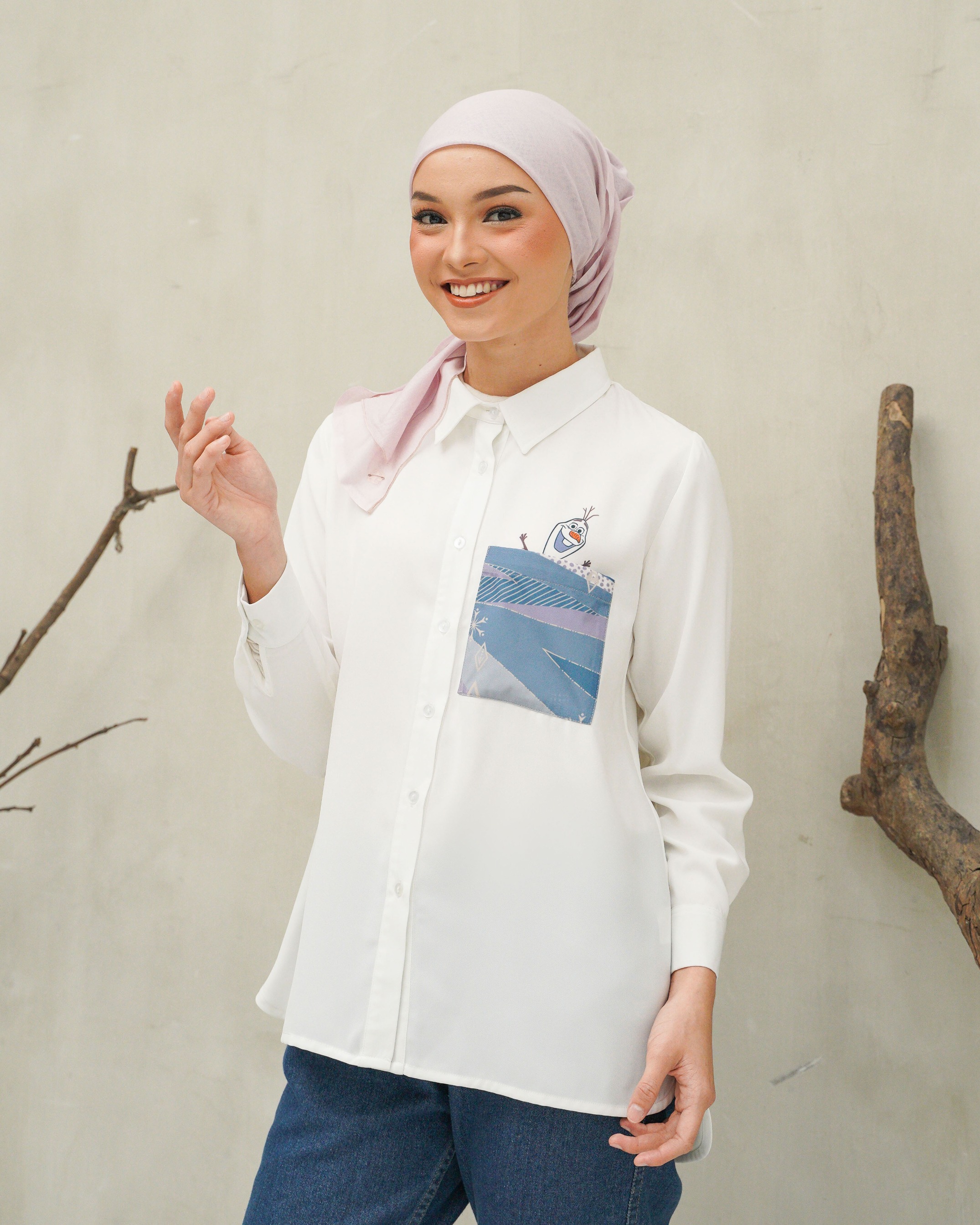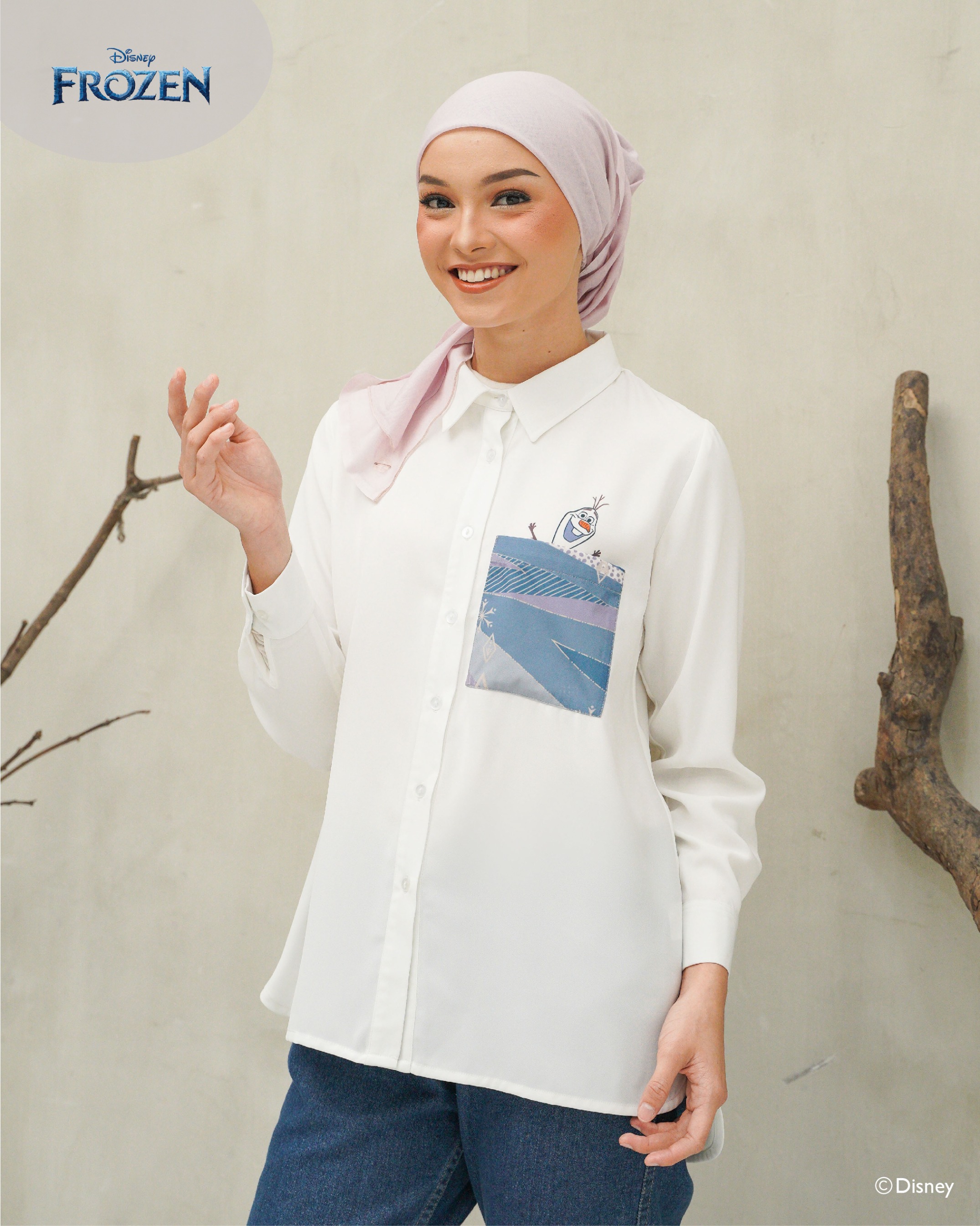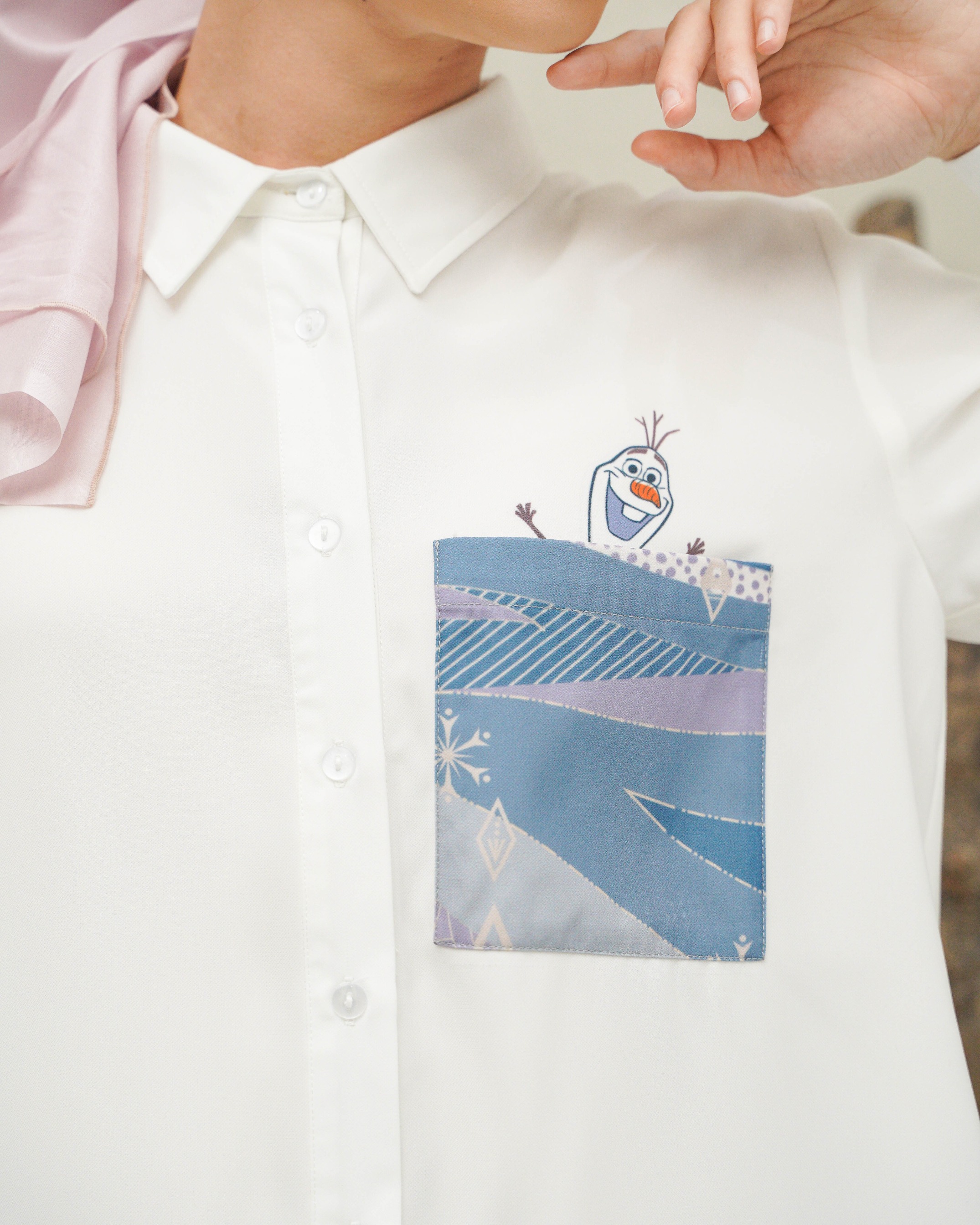 Bahan Fine polyester. Tebal, flowy dan tidak kusut. Dengan detail printed pattern Olaf di bagian saku depan.