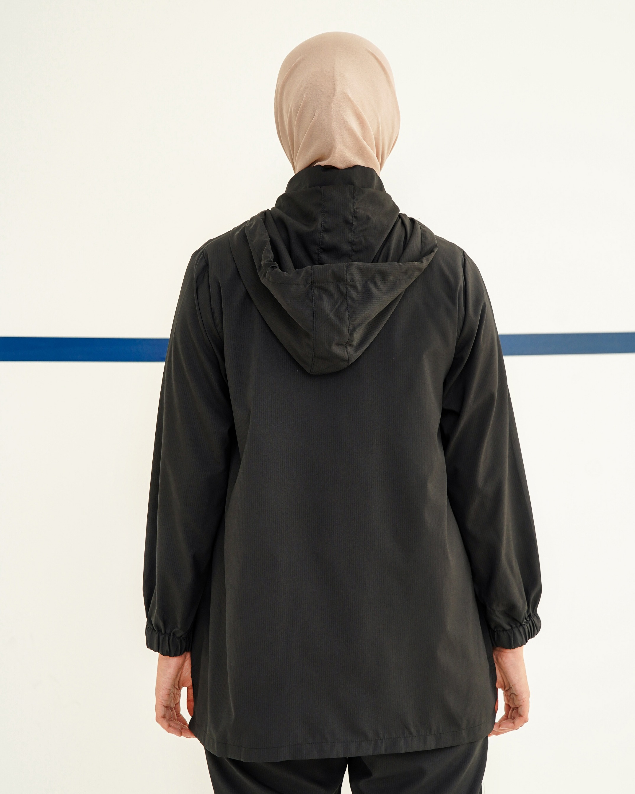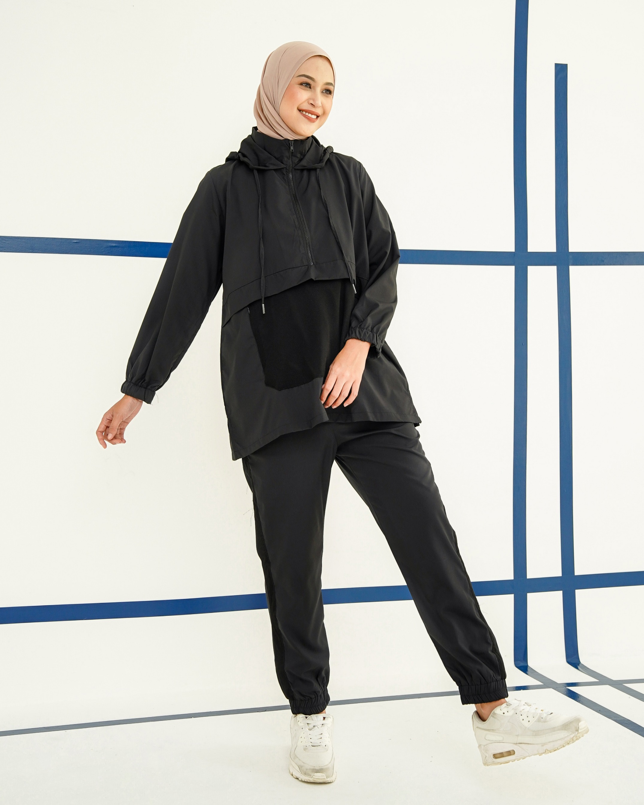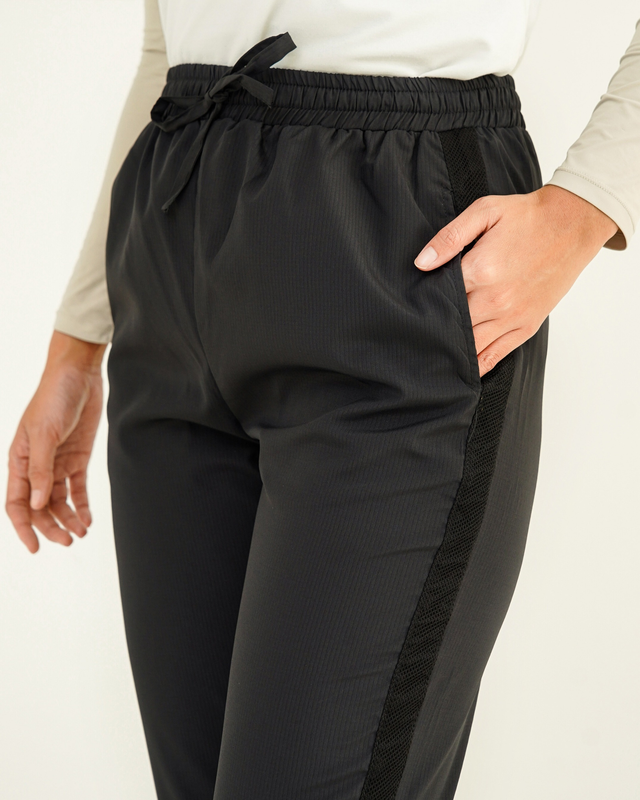 Material poliester sintetis dan mesh knit. Sejuk, tidak shiny. Terdapat tali adjustable, lingkar karet bawah.