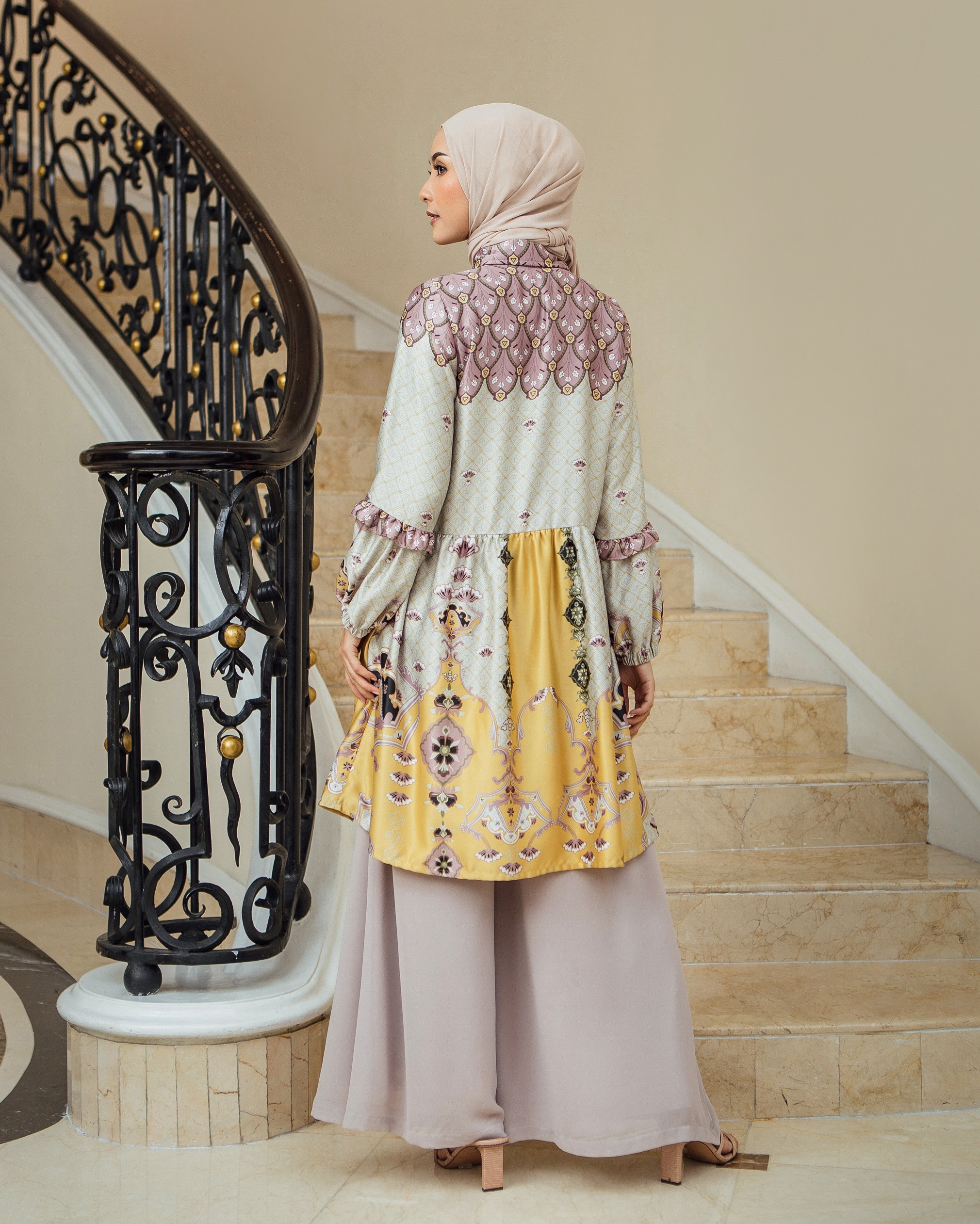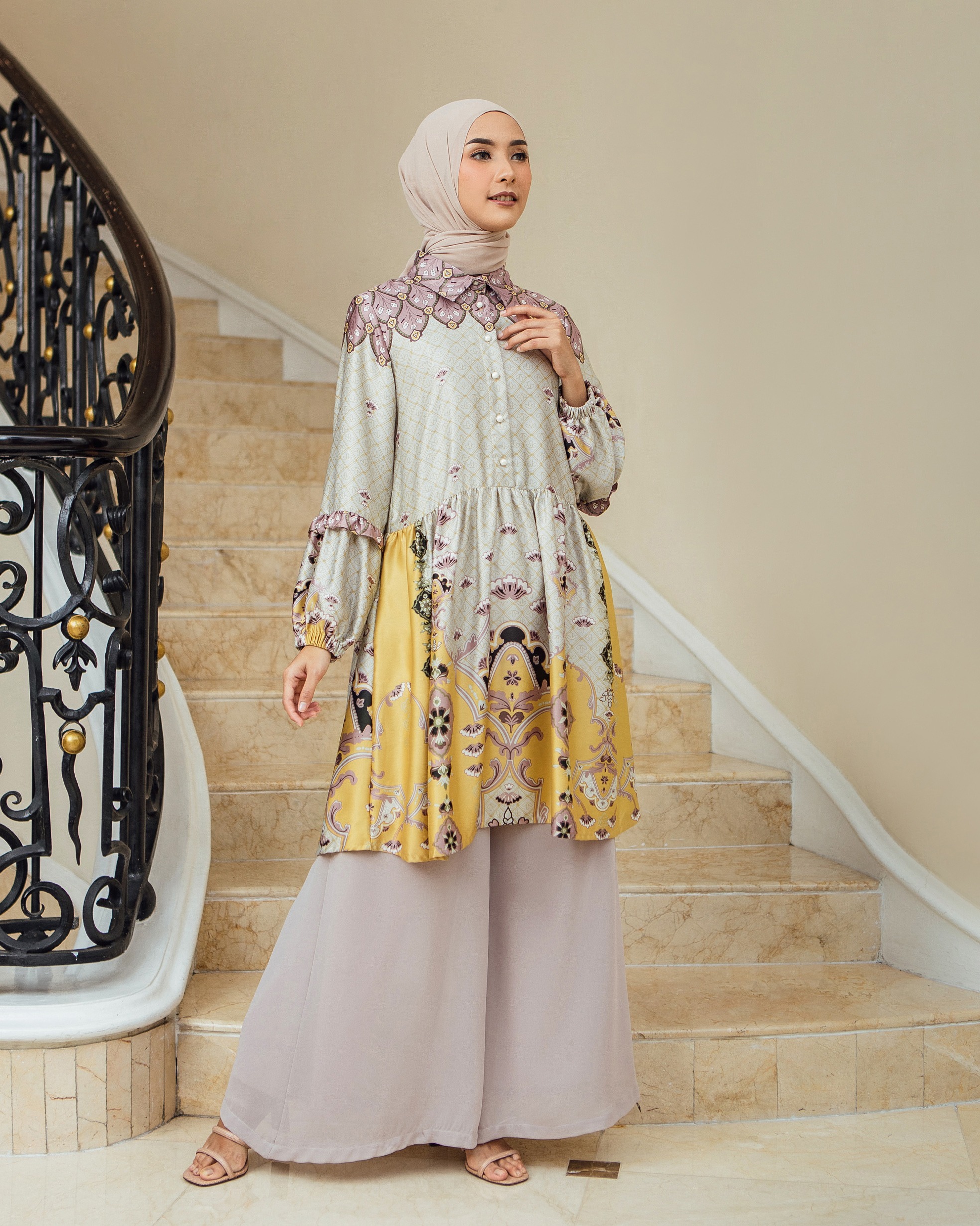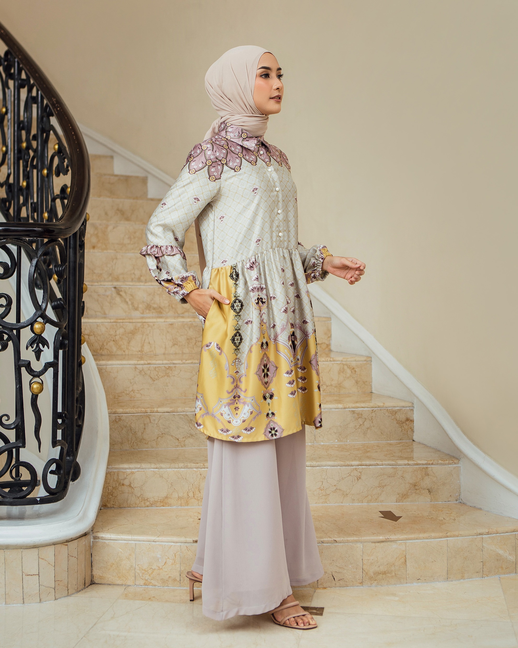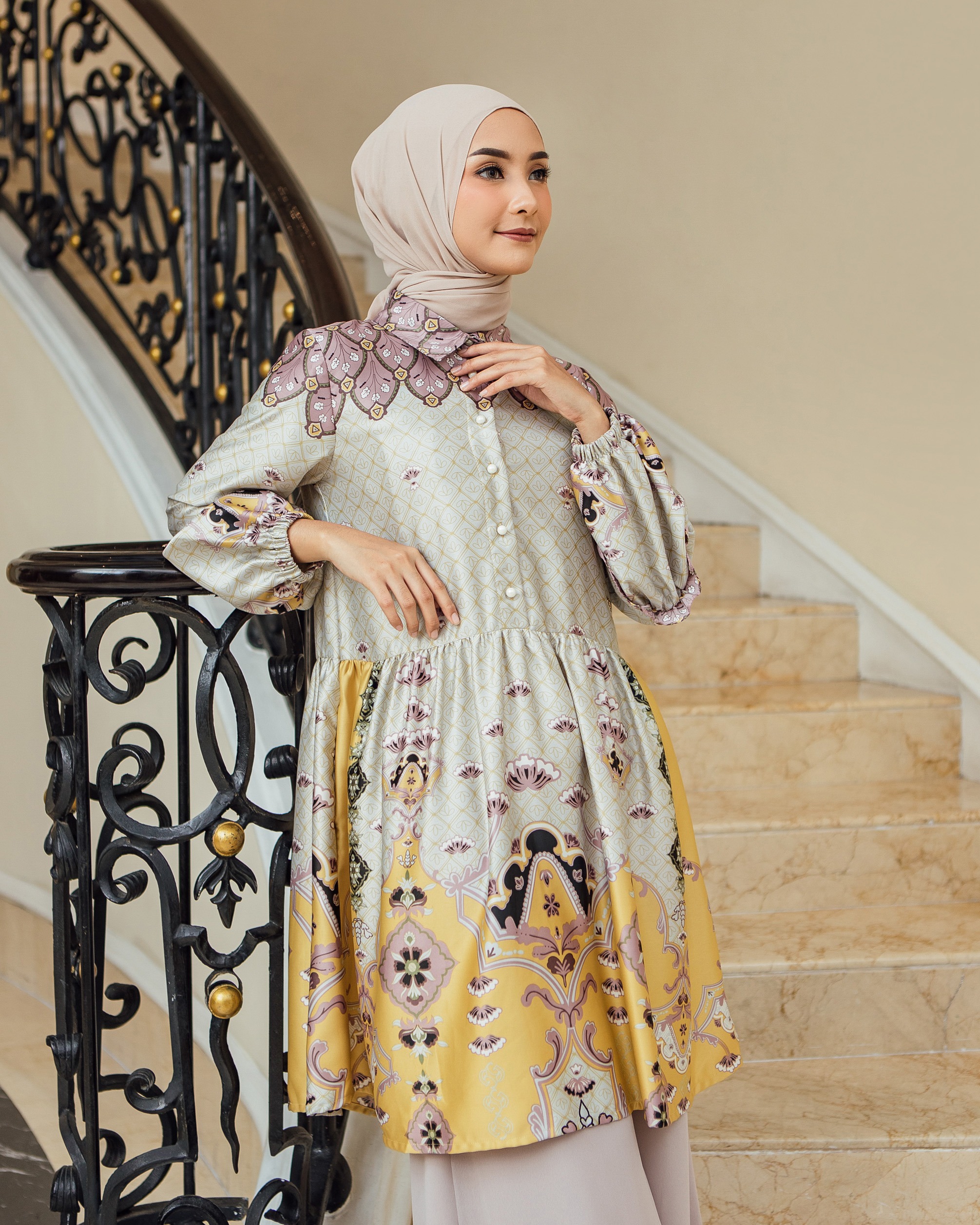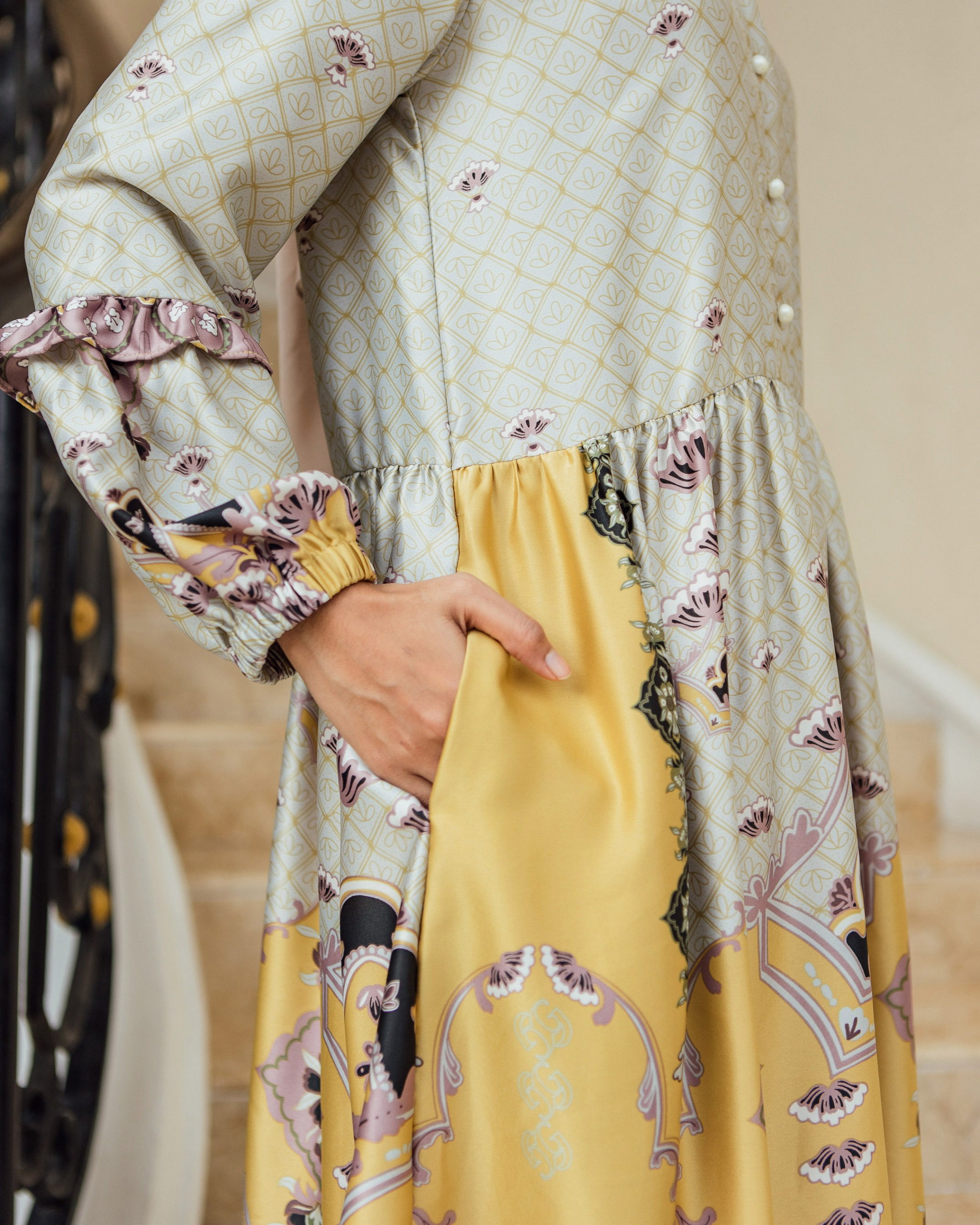 Pattern Exclusive printed di bahan Geulis Doff Silk. Tidak mengkilap berlebih, Nyaman, mewah & tidak kusut