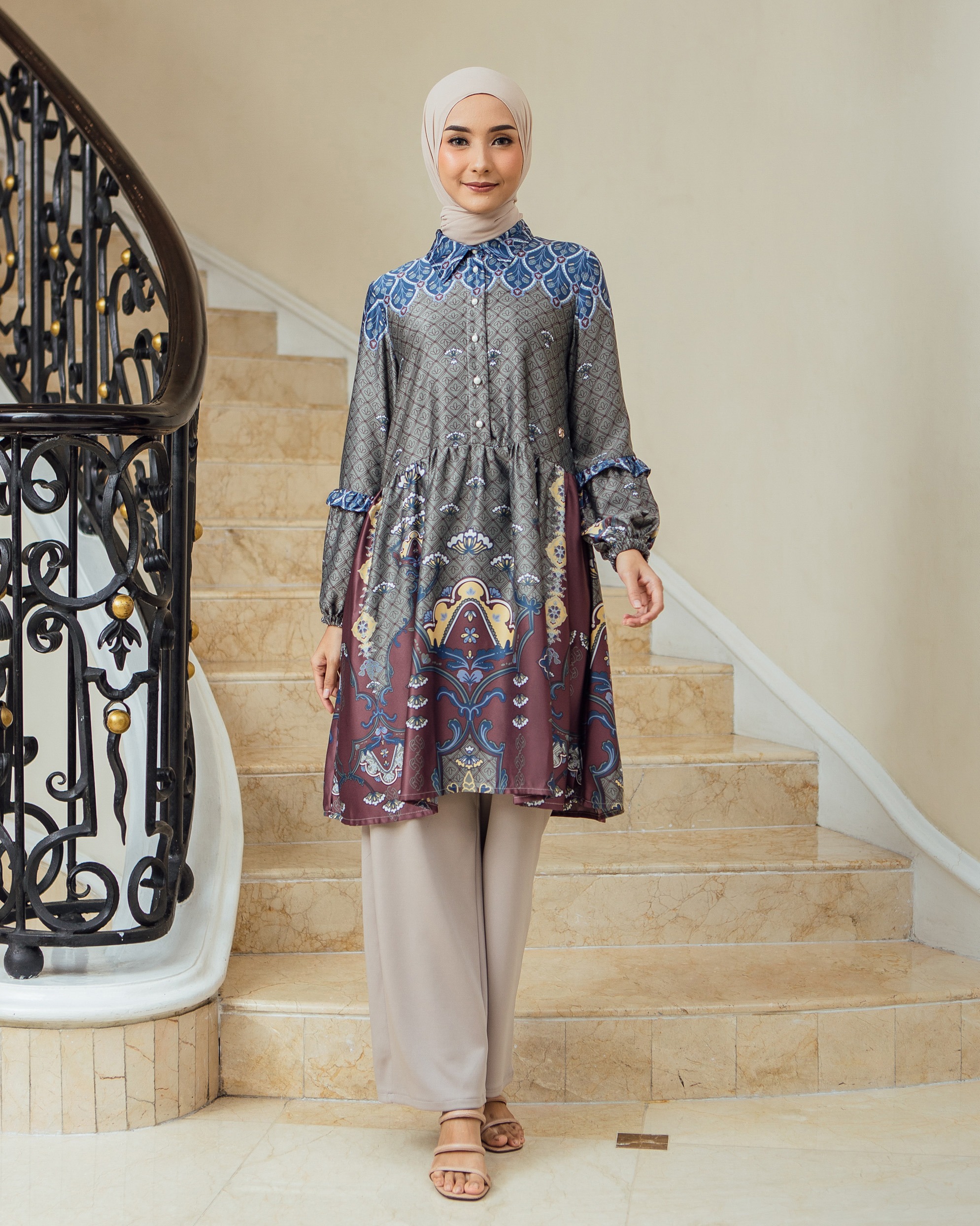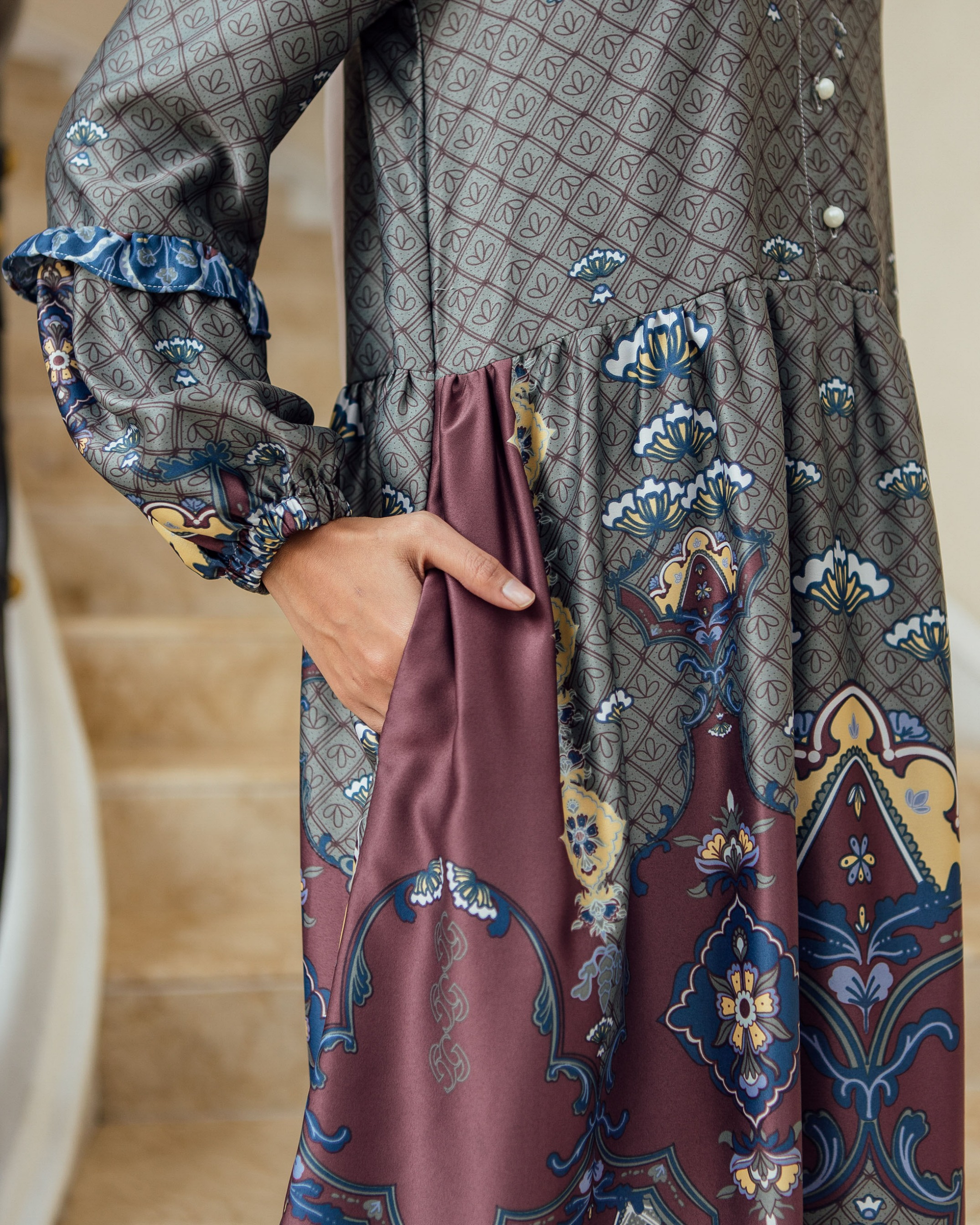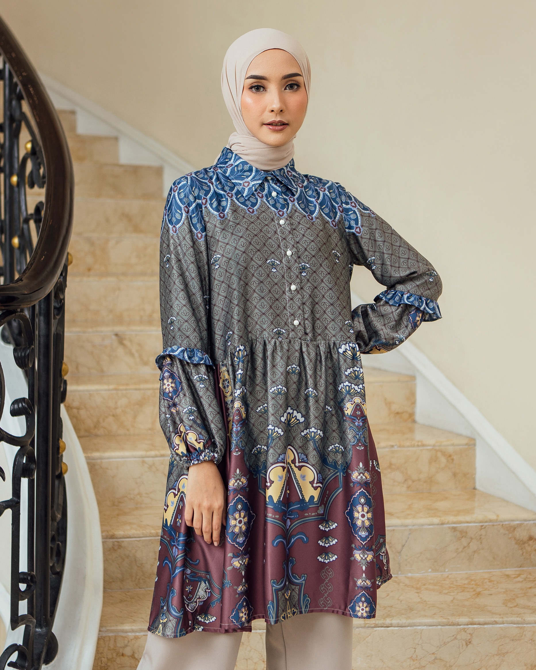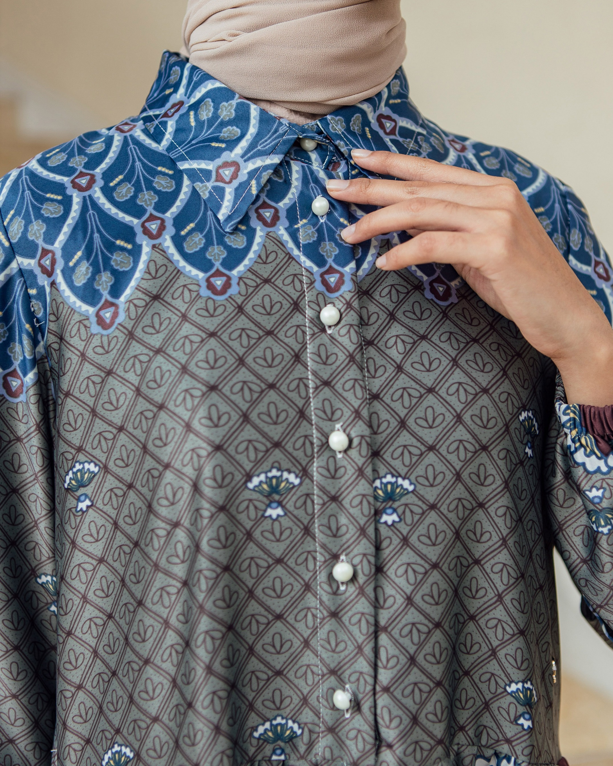 Pattern Exclusive printed di bahan Geulis Doff Silk. Tidak mengkilap berlebih, Nyaman, mewah & tidak kusut