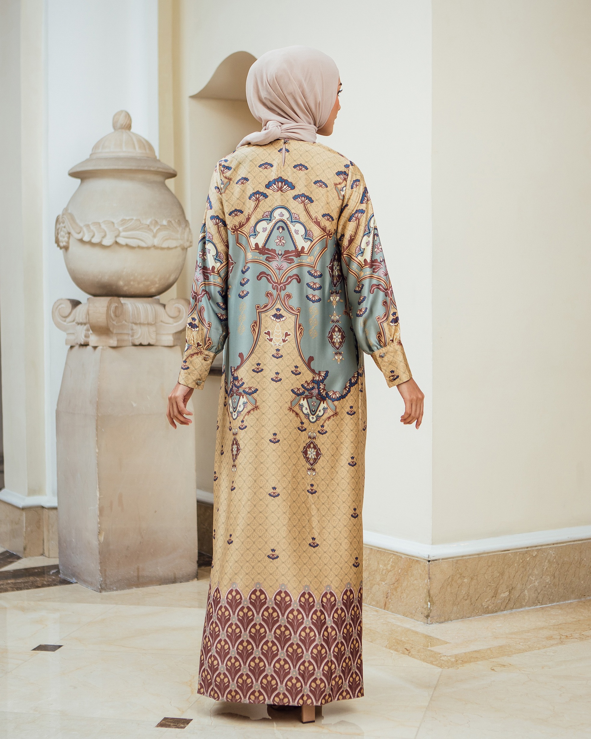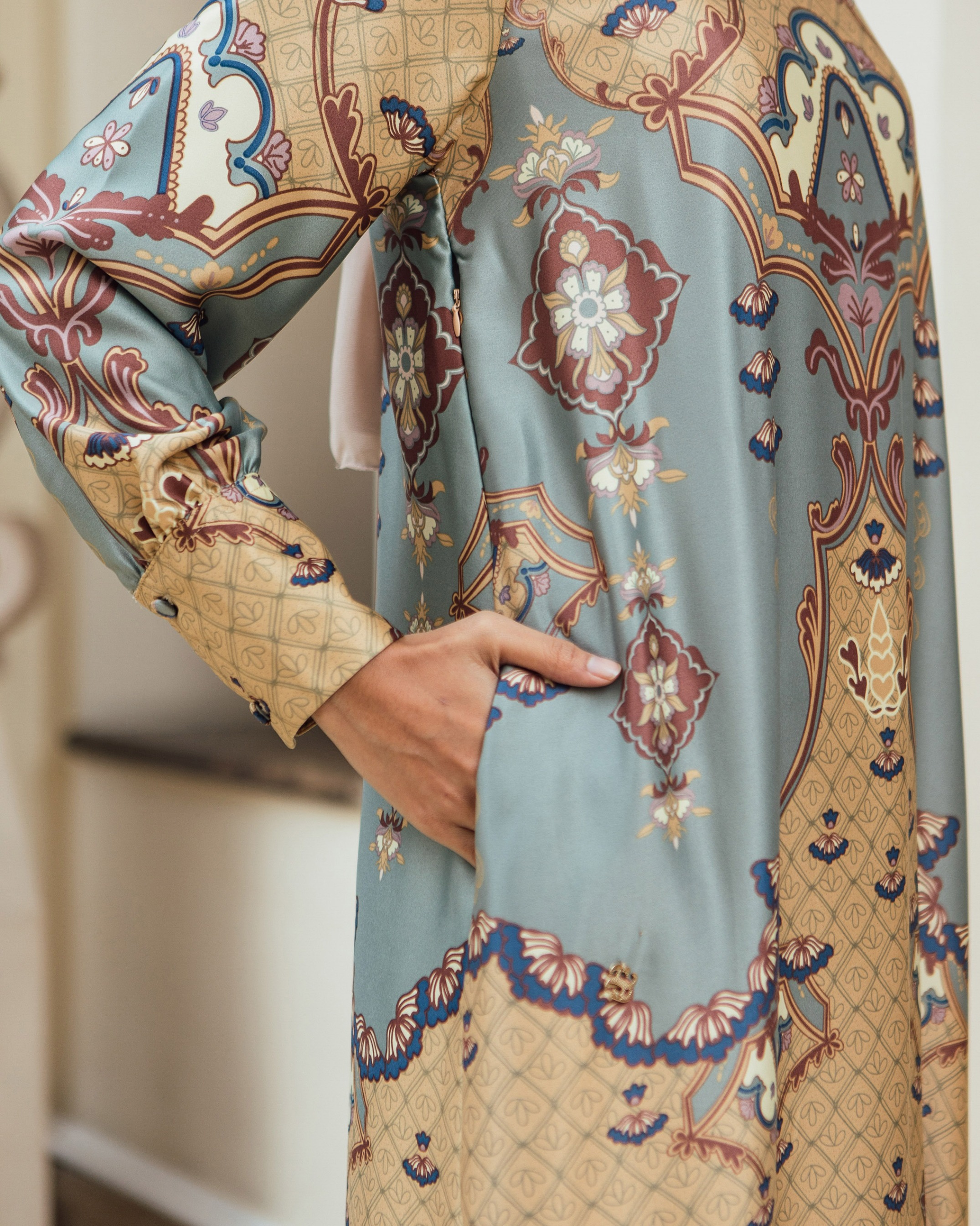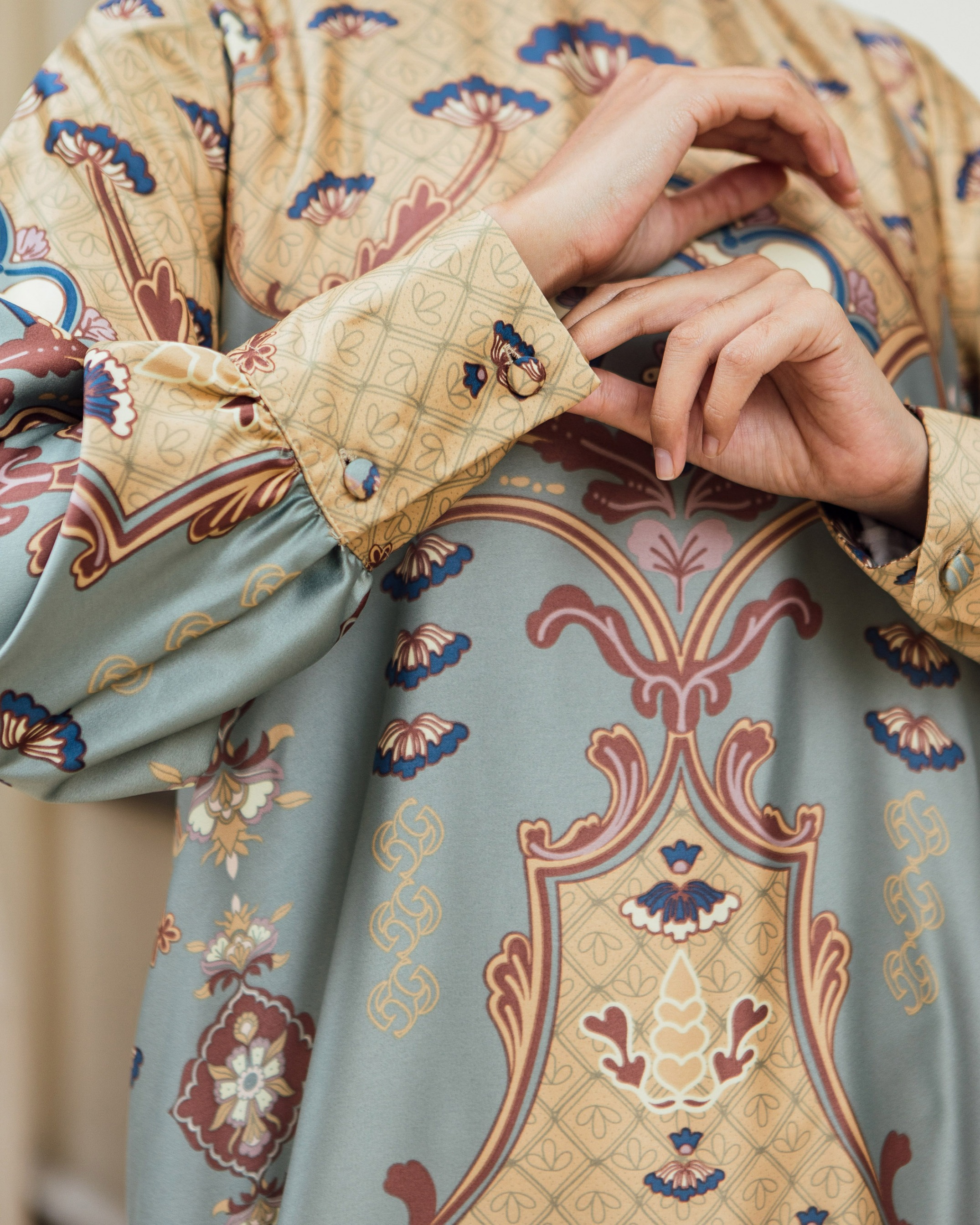 Pattern Exclusive printed di bahan Geulis Doff Silk. Tidak mengkilap berlebih, Nyaman, mewah & tidak kusut