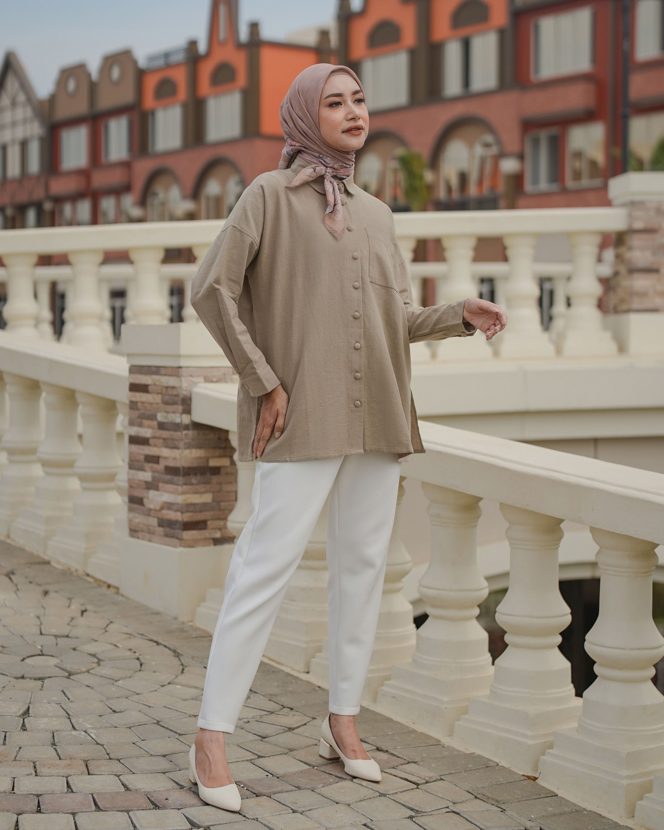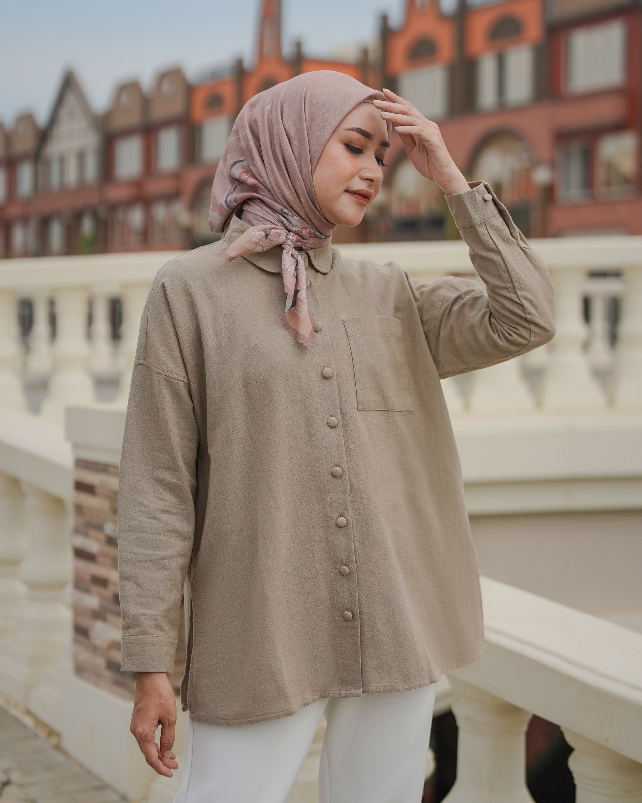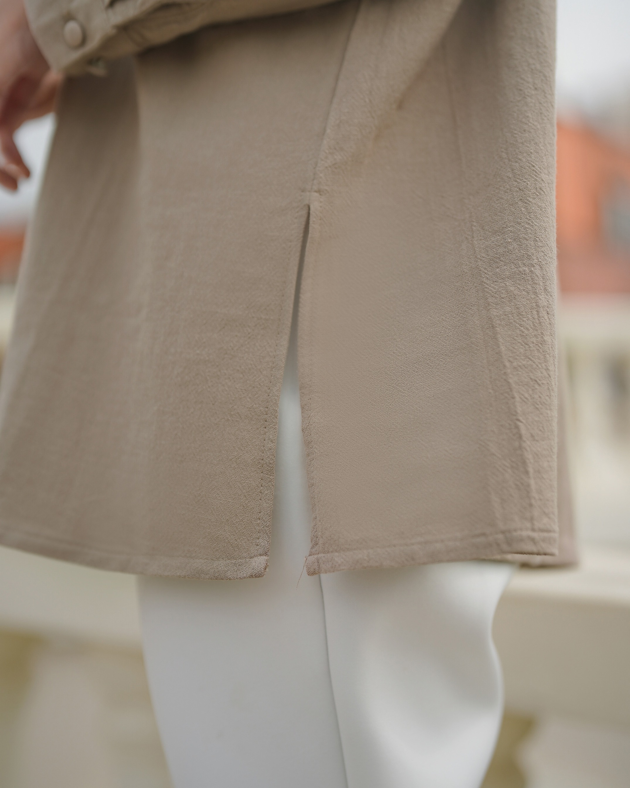 On model pakai size S . Bahan cotton linen textured premium. Tebal, sejuk menyerap keringat dan mewah. ✔️ Terdapat kancing hidup full ✔️ Lengan manset karet wudhu friendly ✔️ Saku di kiri atas. Tersedia 4 warna dengan ukuran lengkap S M L Lingkar Dada : 104/115/126 Kerung Lengan : 18-20/20-22/22-24 Panjang Top: 75-78 Best linen fabric!