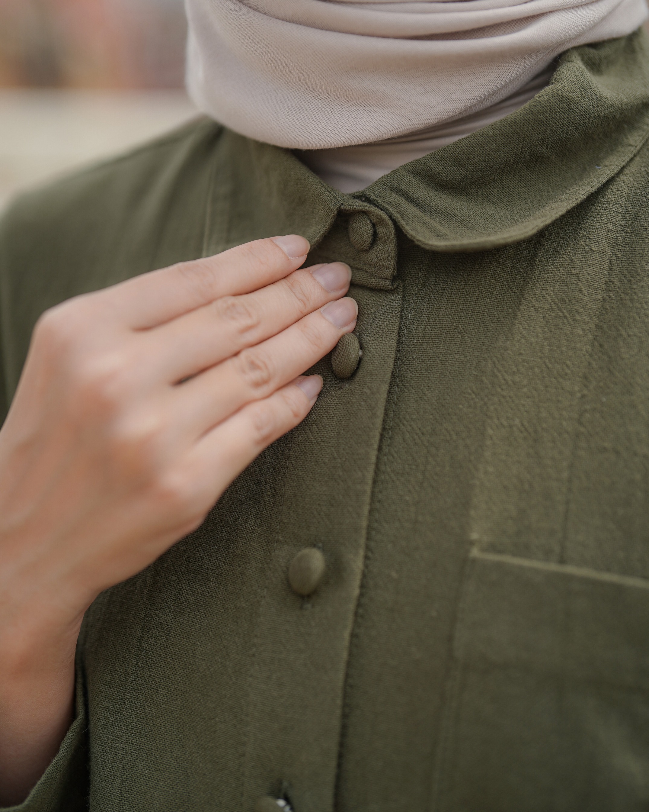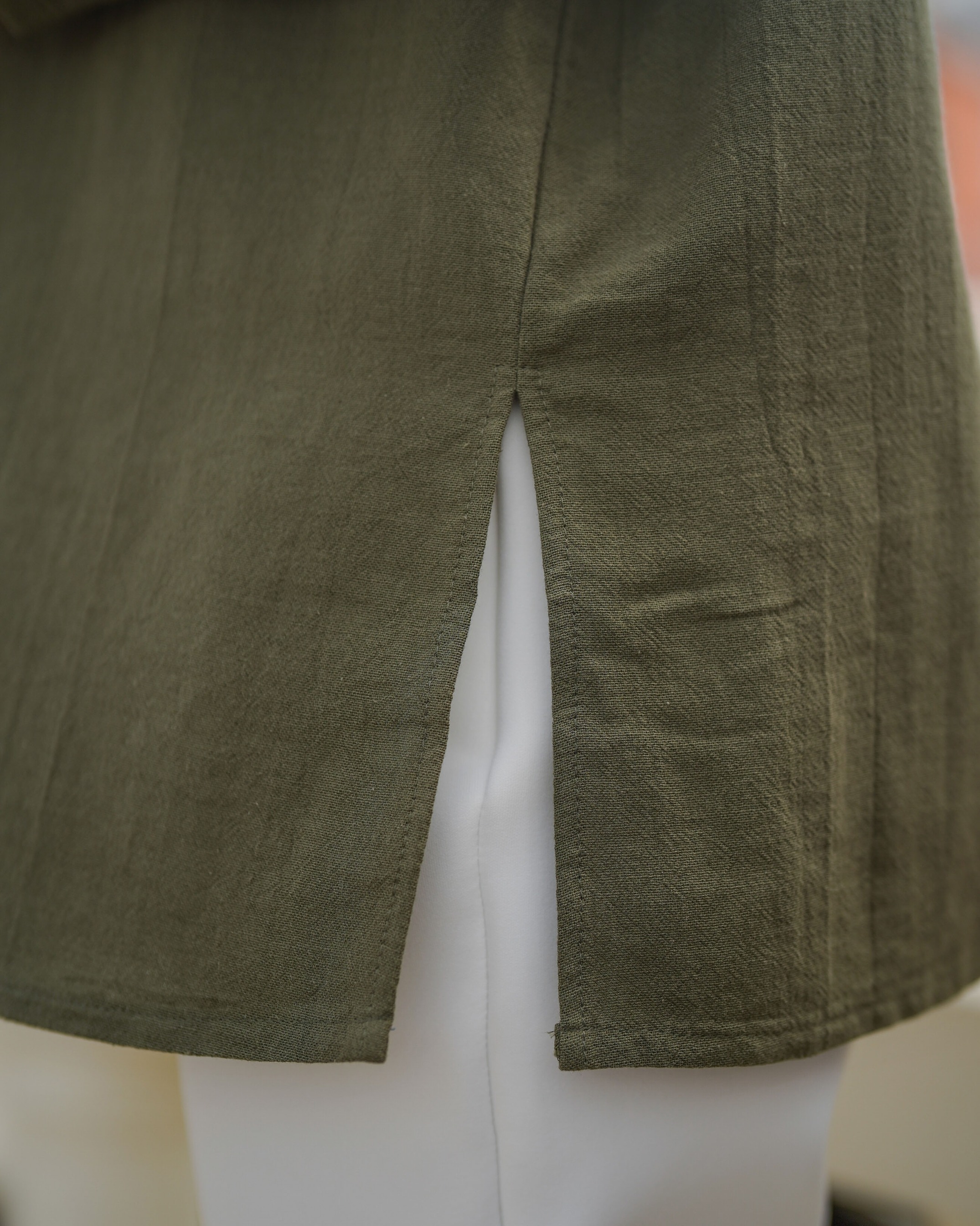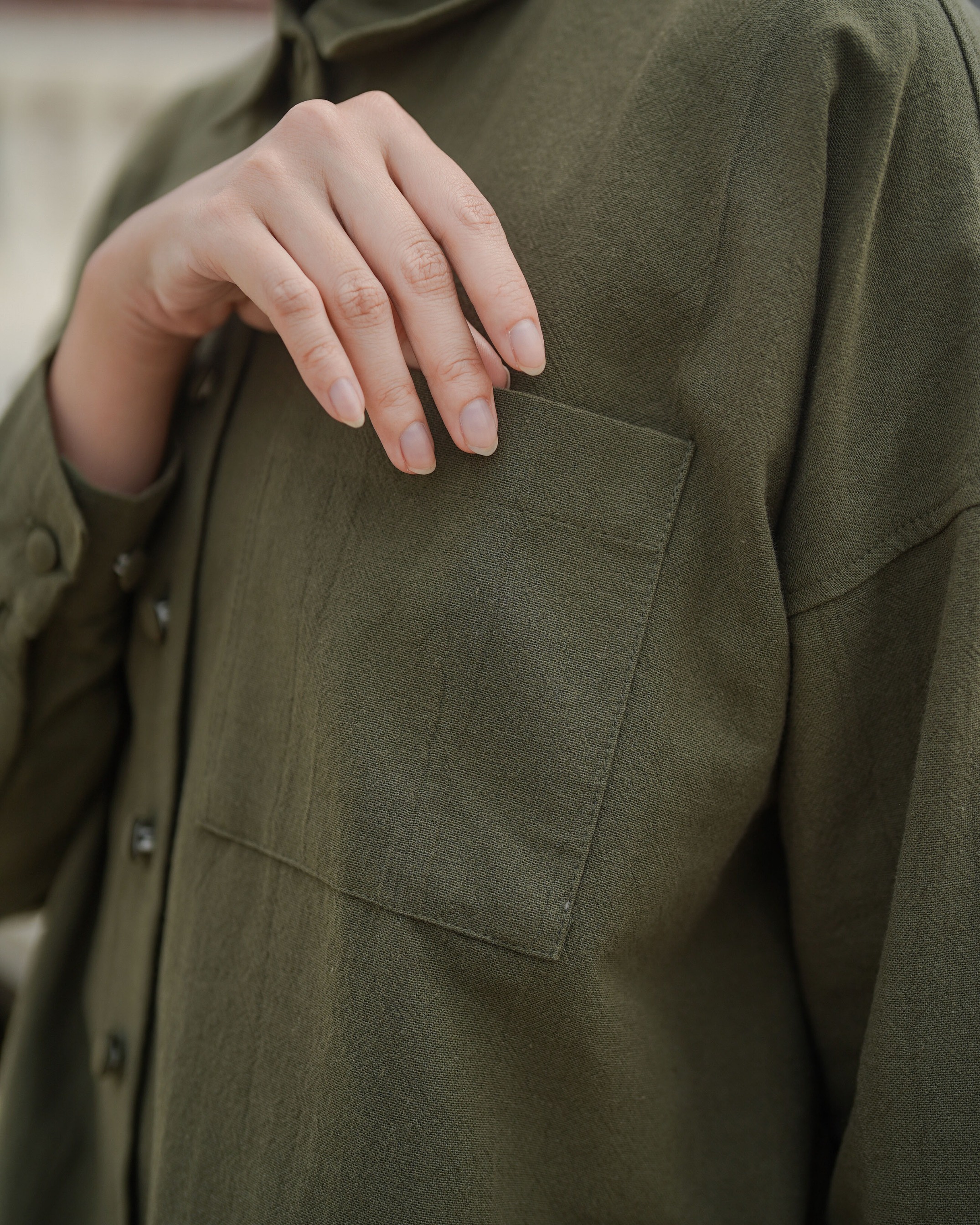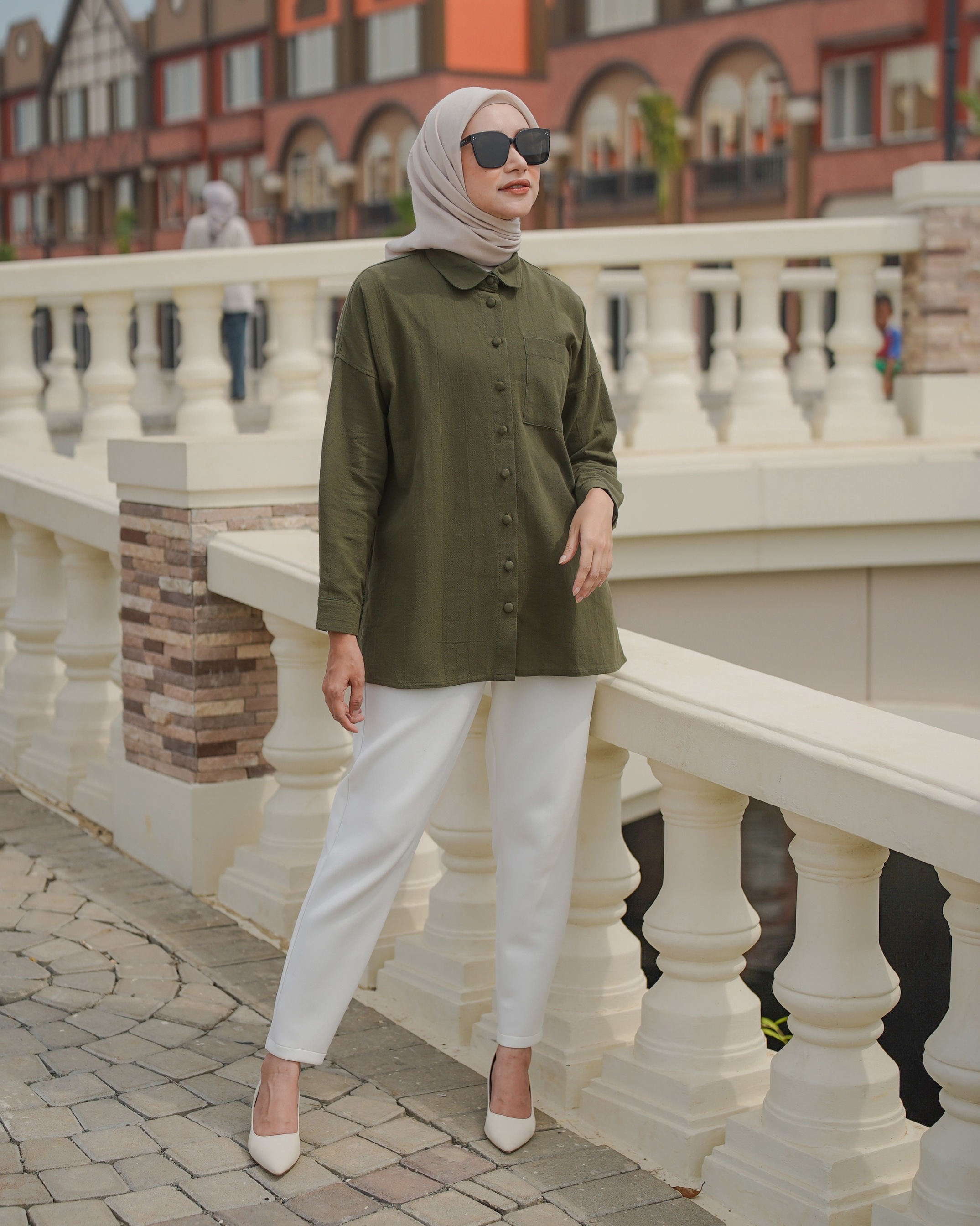 On model pakai size S . Bahan cotton linen textured premium. Tebal, sejuk menyerap keringat dan mewah. ✔️ Terdapat kancing hidup full ✔️ Lengan manset karet wudhu friendly ✔️ Saku di kiri atas. Tersedia 4 warna dengan ukuran lengkap S M L Lingkar Dada : 104/115/126 Kerung Lengan : 18-20/20-22/22-24 Panjang Top: 75-78 Best linen fabric!