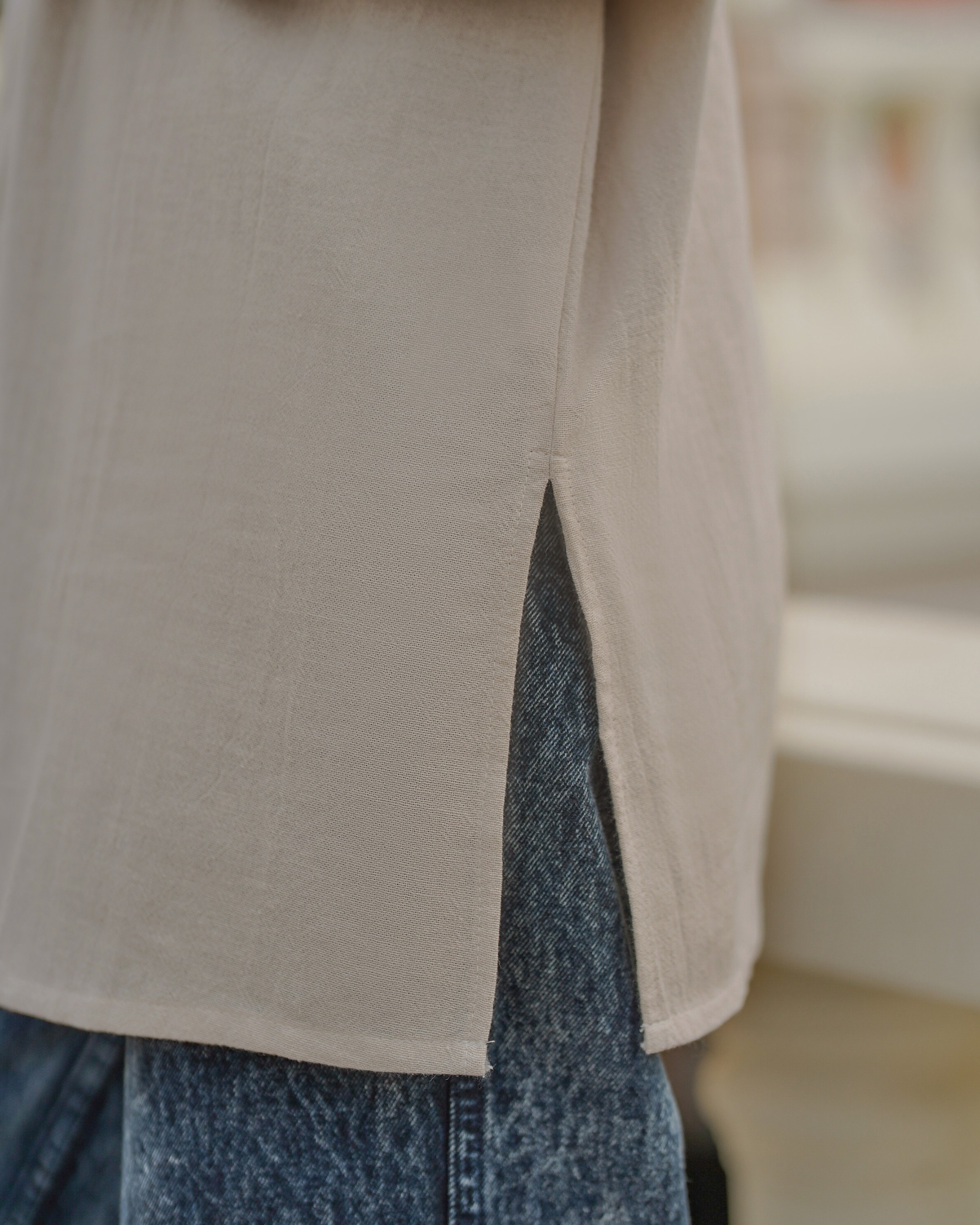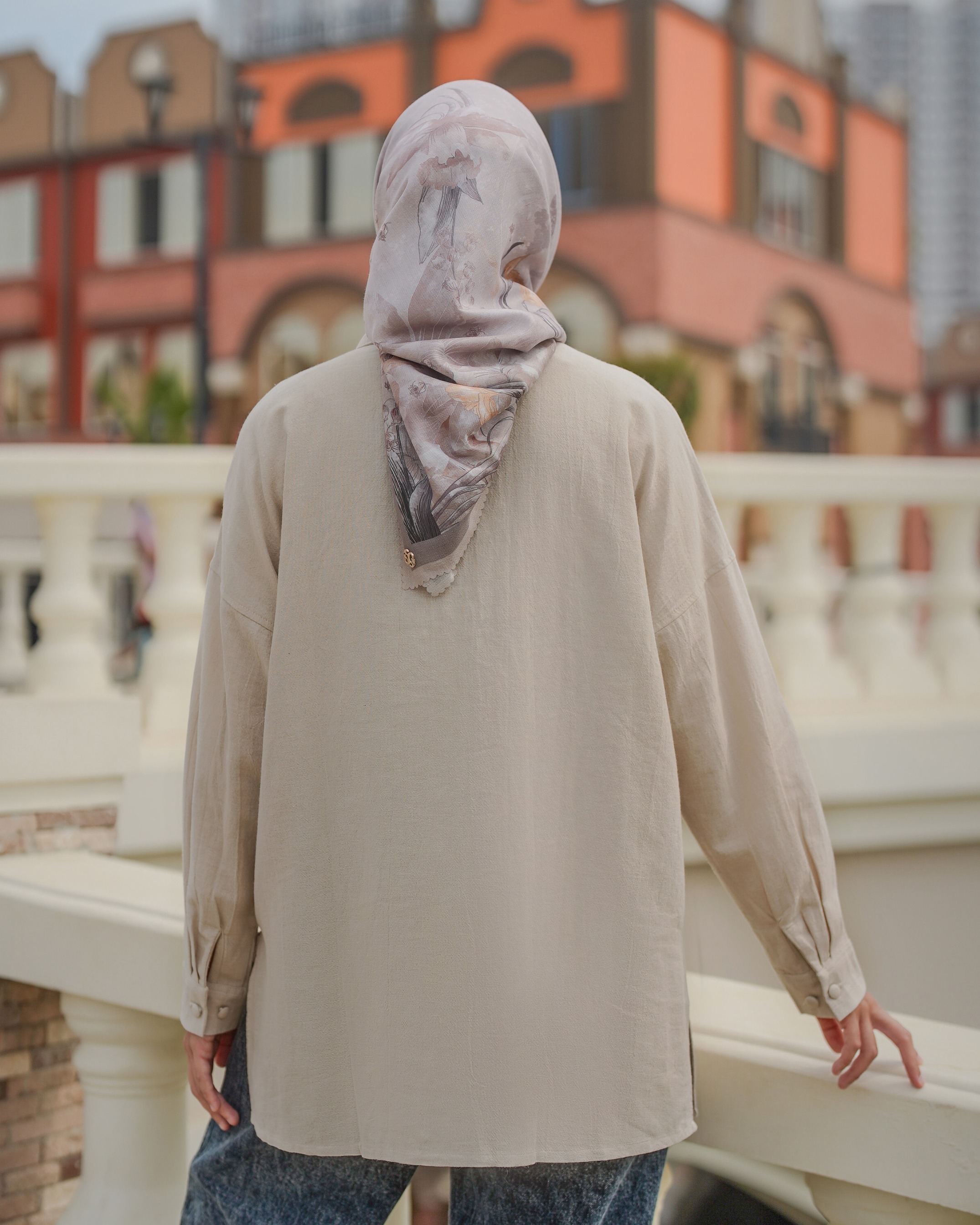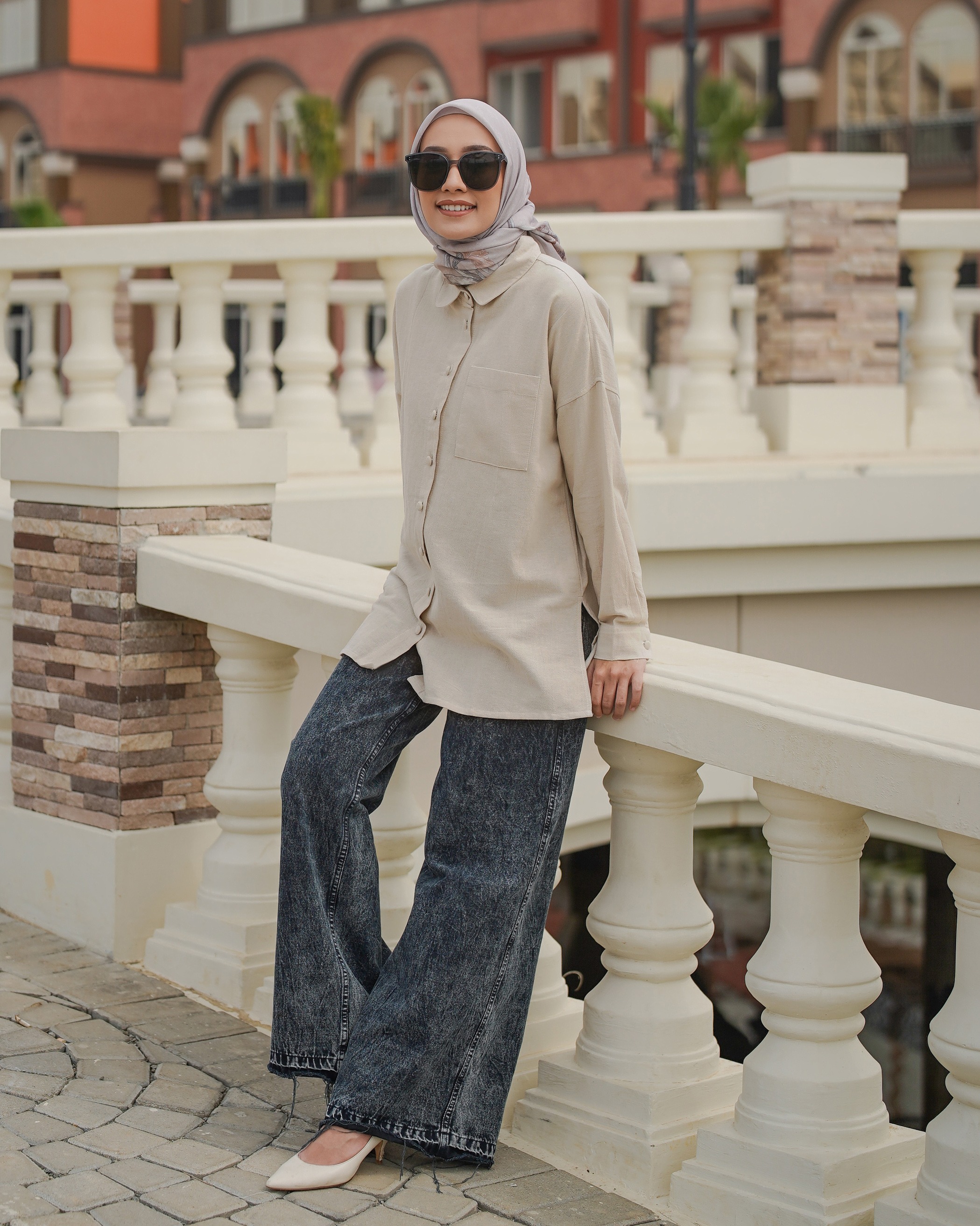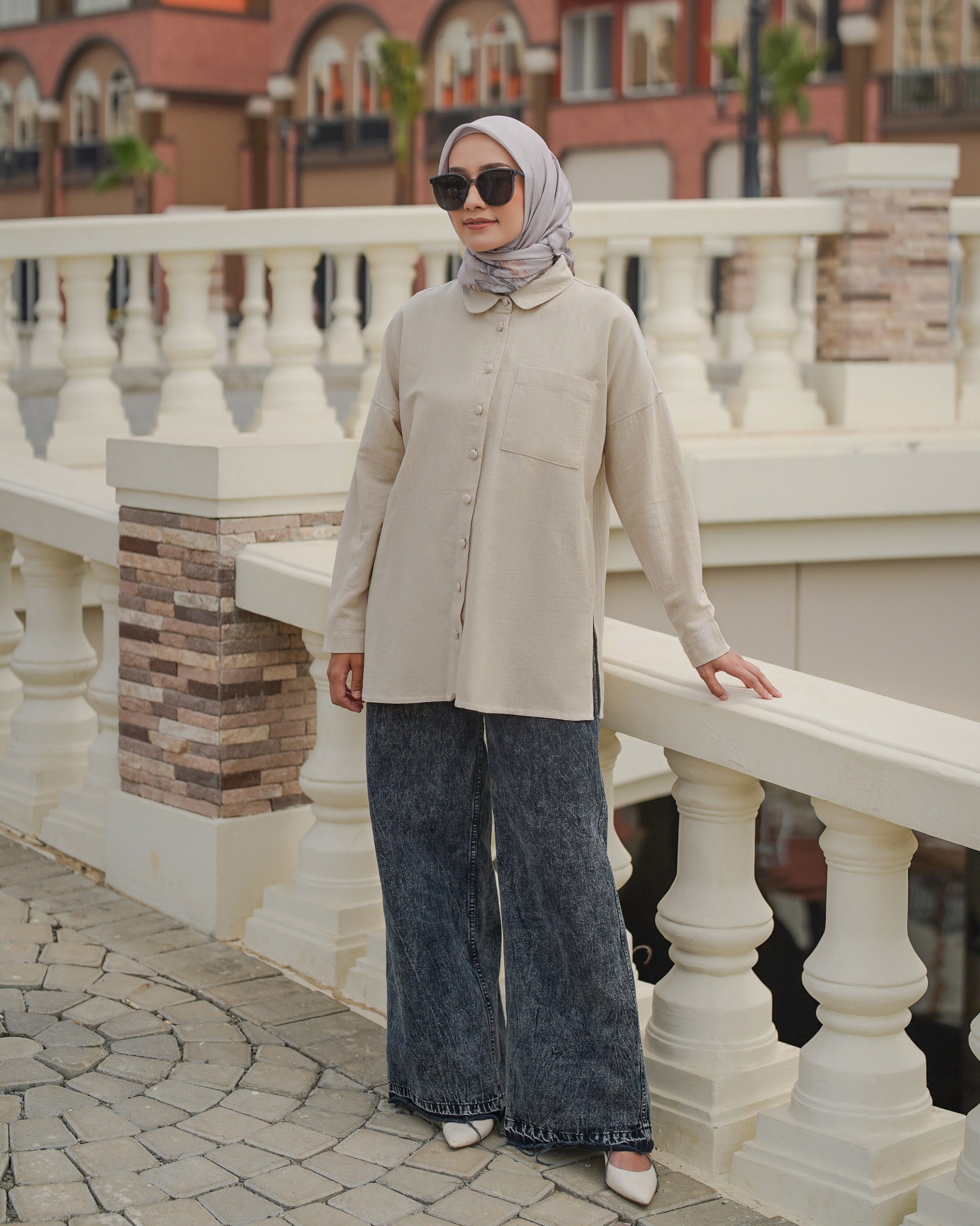 On model pakai size S . Bahan cotton linen textured premium. Tebal, sejuk menyerap keringat dan mewah. ✔️ Terdapat kancing hidup full ✔️ Lengan manset karet wudhu friendly ✔️ Saku di kiri atas. Tersedia 4 warna dengan ukuran lengkap S M L Lingkar Dada : 104/115/126 Kerung Lengan : 18-20/20-22/22-24 Panjang Top: 75-78 Best linen fabric!