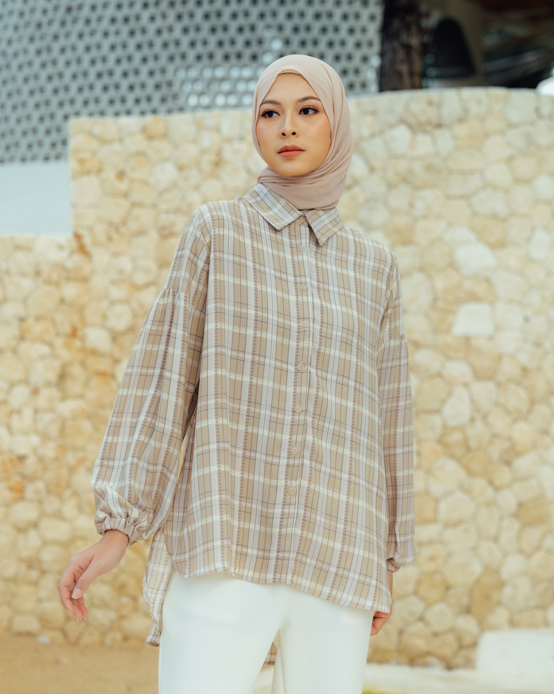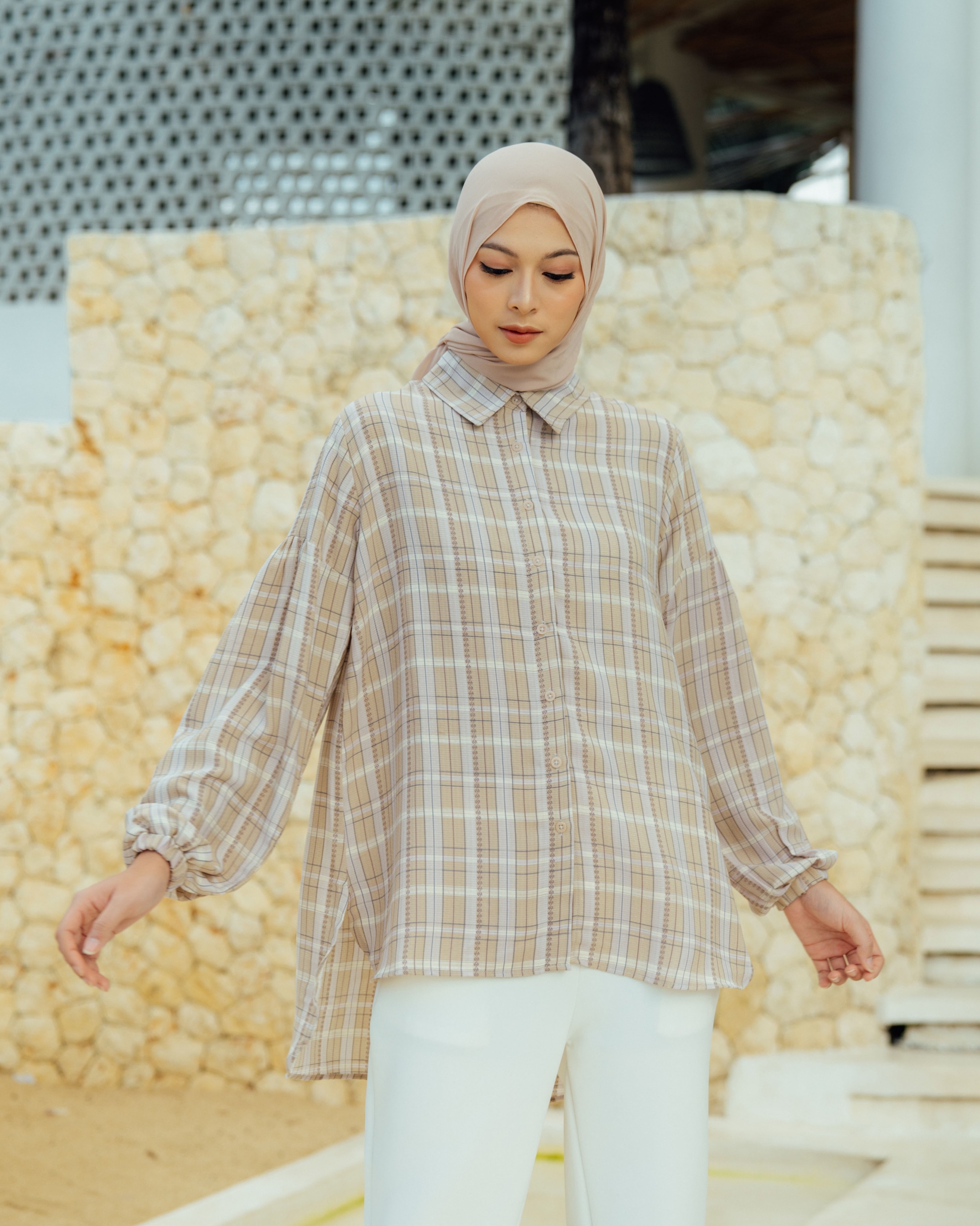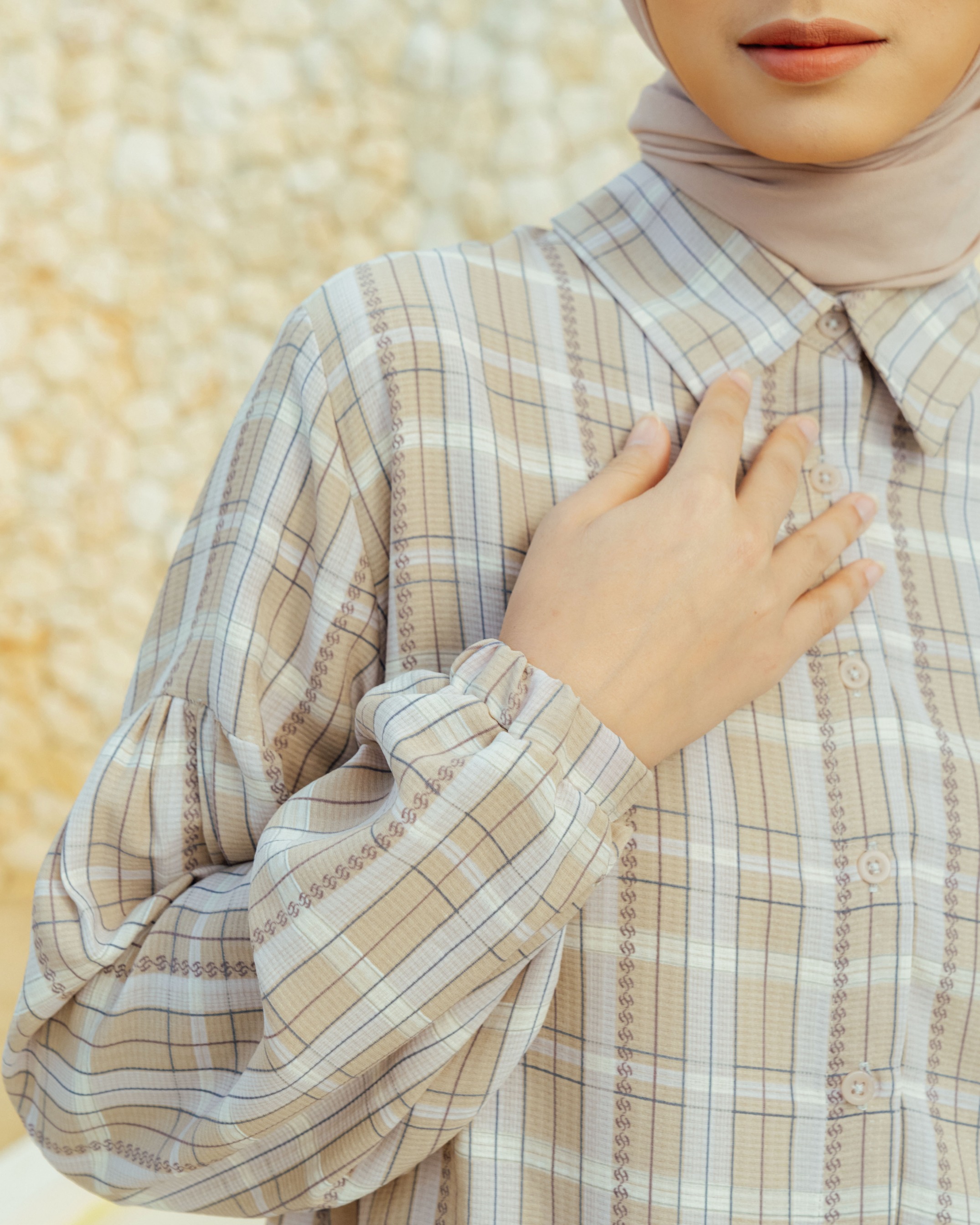 On model size S . Bahan poly cotton dobby high quality printed. Flowy, Berteksture ✔️Bahan sejuk saat digunakan ✔️Terdapat full kancing hidup ✔️Terdapat cuttingan lengan yang memberi kesan feminine serta detail manset karet Tersedia 4 warna dan size lengkap S M L XL Lingkar Dada : 98/104/110/120 Lingkar Kerung Lengan : 49/52/55/60 Panjang Top Depan : 72cm Panjang Top Belakang : 85cm