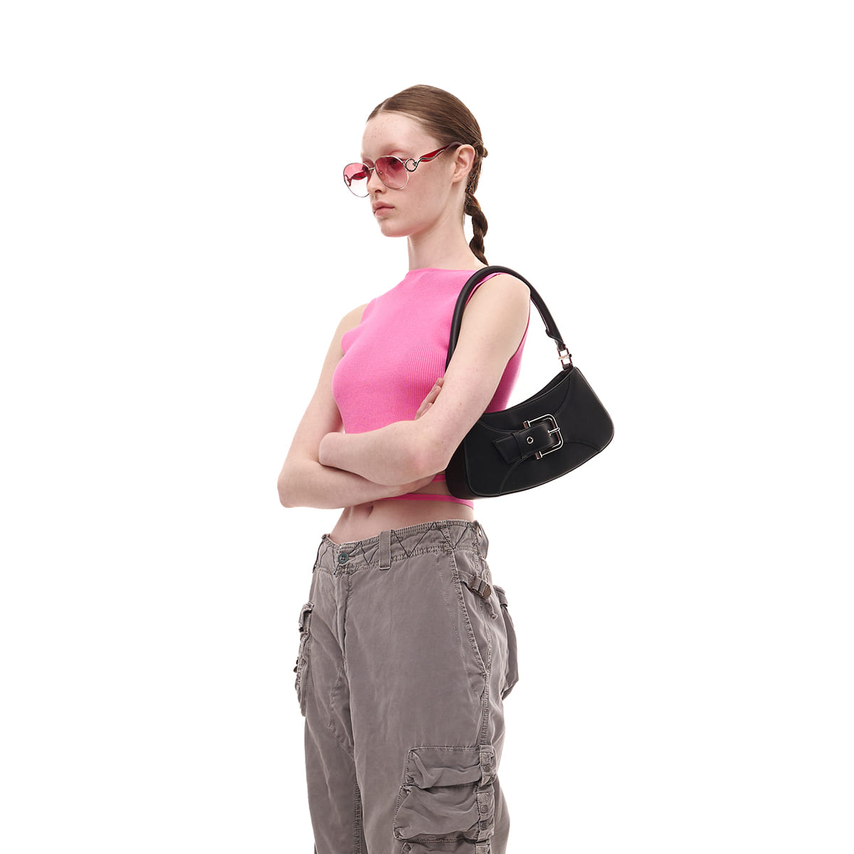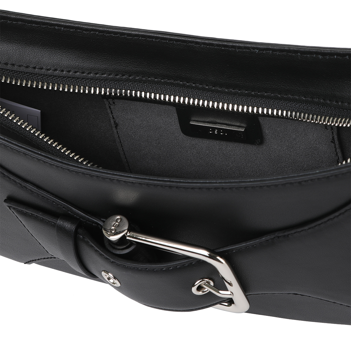 The design was developed based on the main hardware of the BROCLE series, the "buckle", and it is a round square shape bag that feels solid and stable. The buckle, which adds an accent to the image of a belt, is the signature decoration of the BROCLE seri