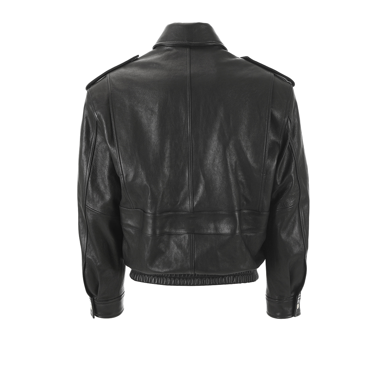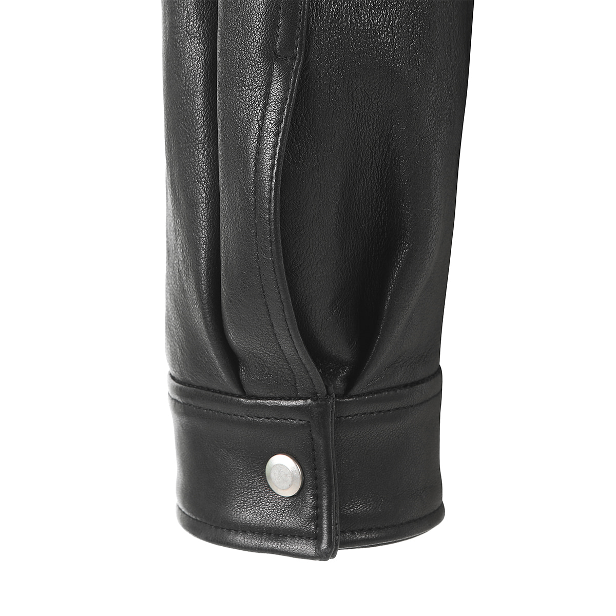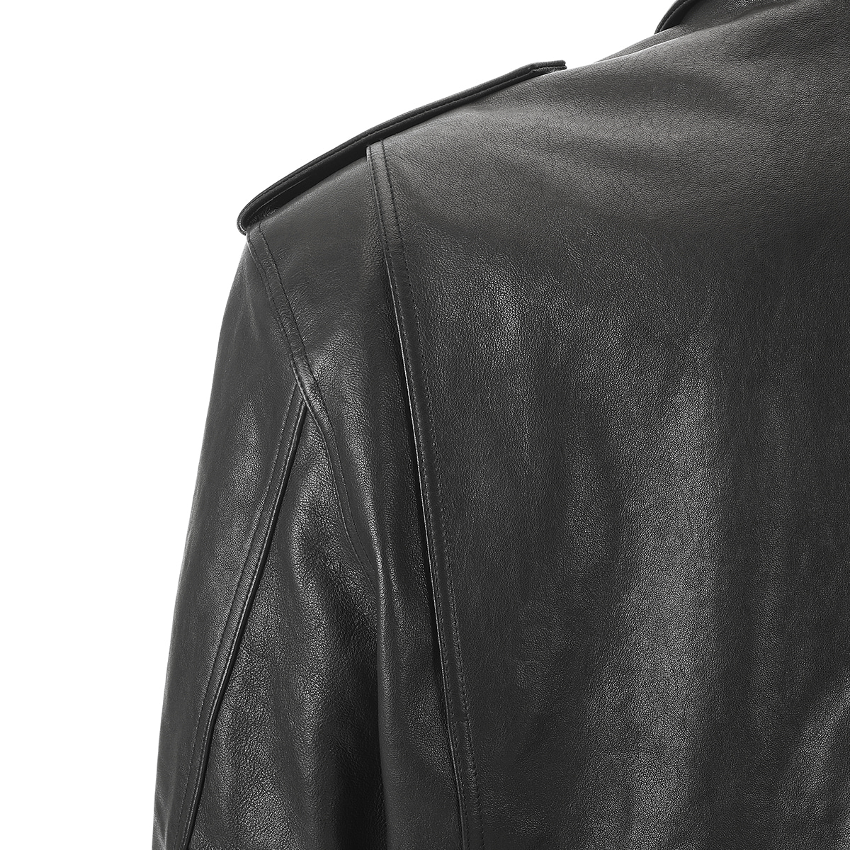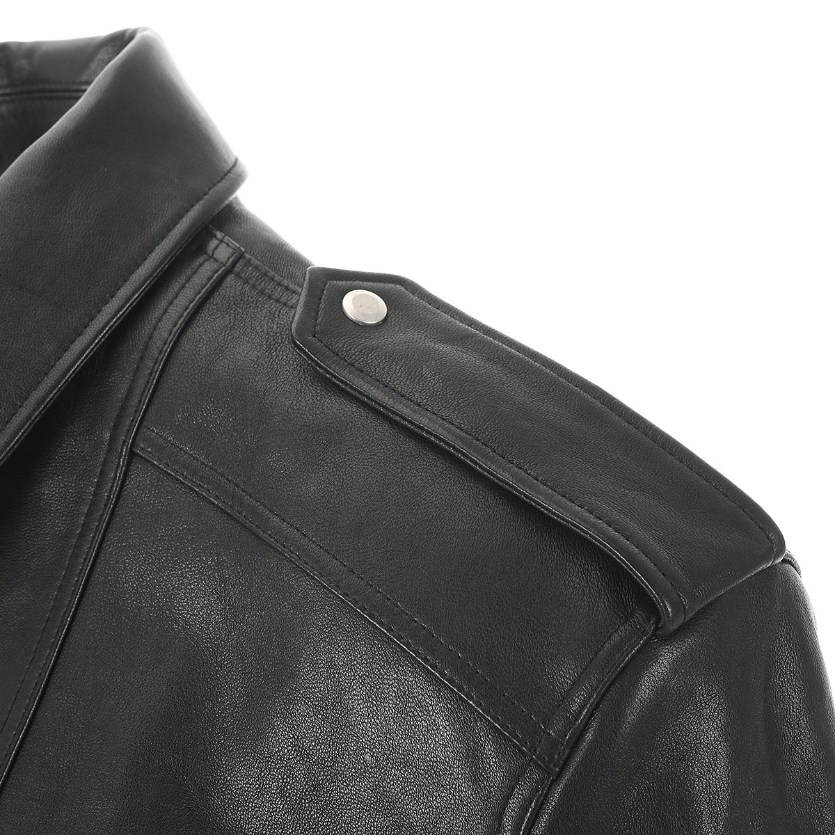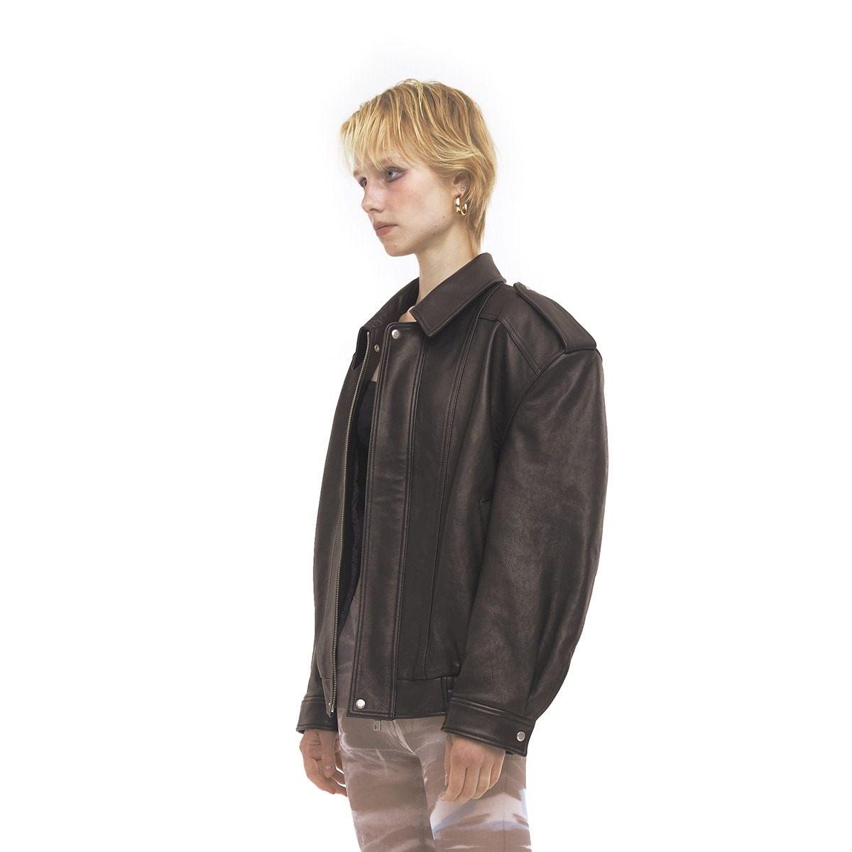 This is an oversized fit rider jacket emphasizing the shoulder line.It is made of natural sheepskin that has a soft and flexible touch and can be worn comfortably with moderate weight.*Because of the nature of natural leather, it is vulnerable to moisture